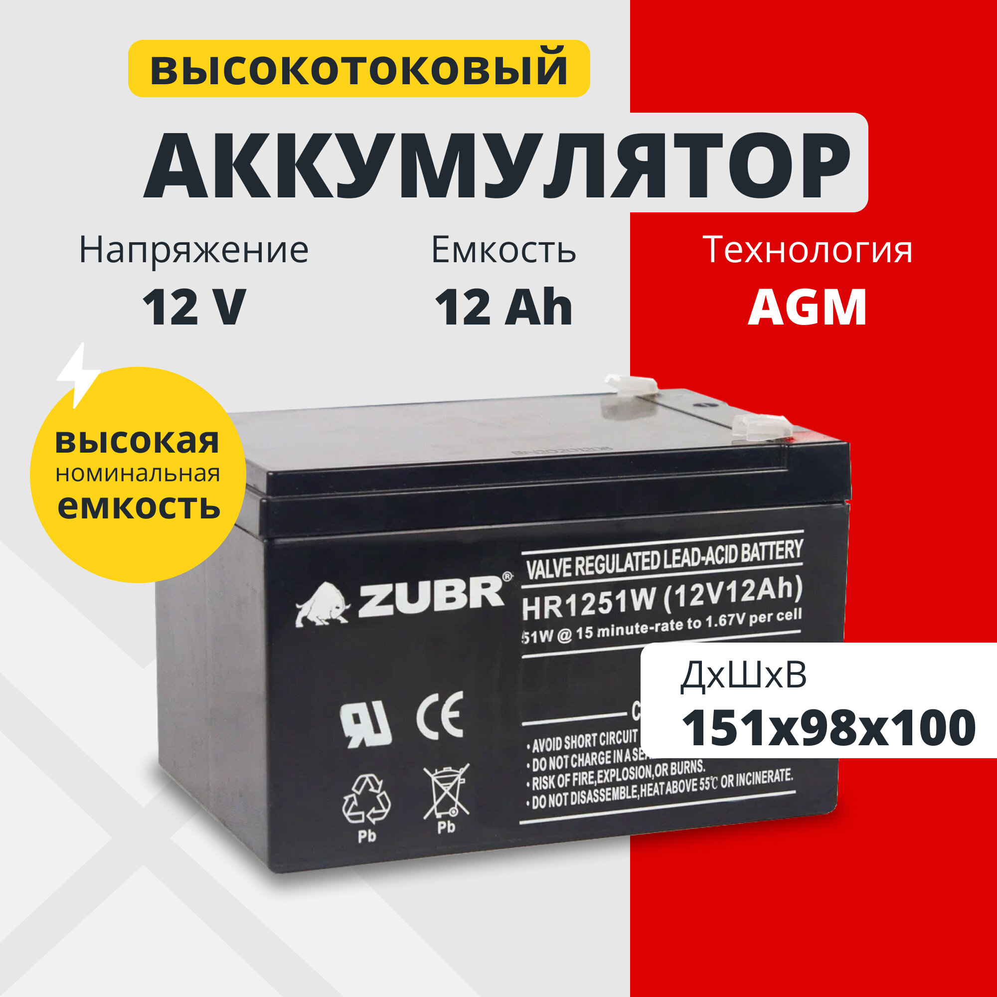 Купить Аккумулятор для ибп 12v 12Ah ZUBR HR12-51W AGM F2/T2 акб насосов, электропастухов 151x98x100 мм