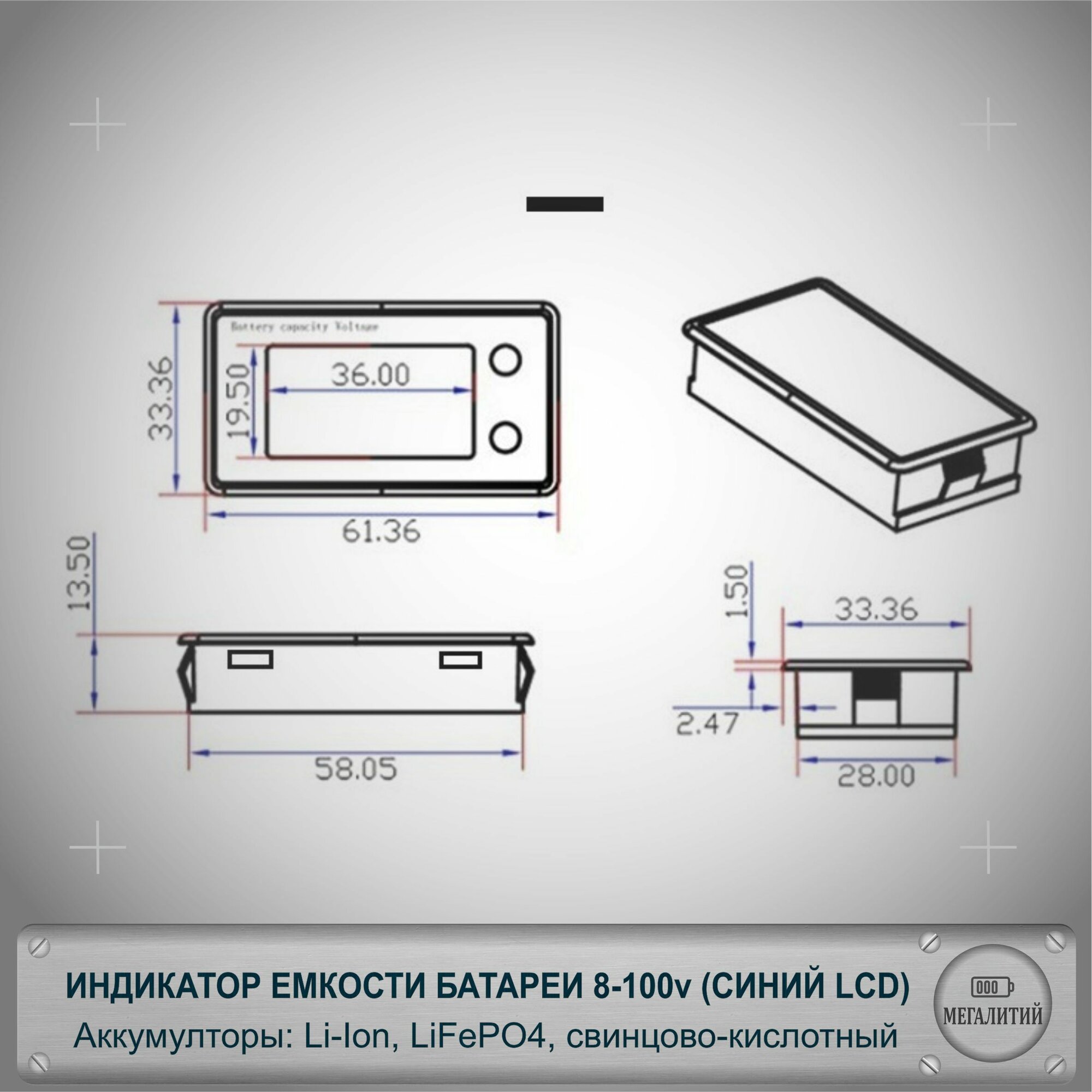 Цифровой индикатор емкости батареи 8-100в ( Li-ion, LiFePO4, кислотный аккумулятор), голубой дисплей, MEGALITIY интересное: