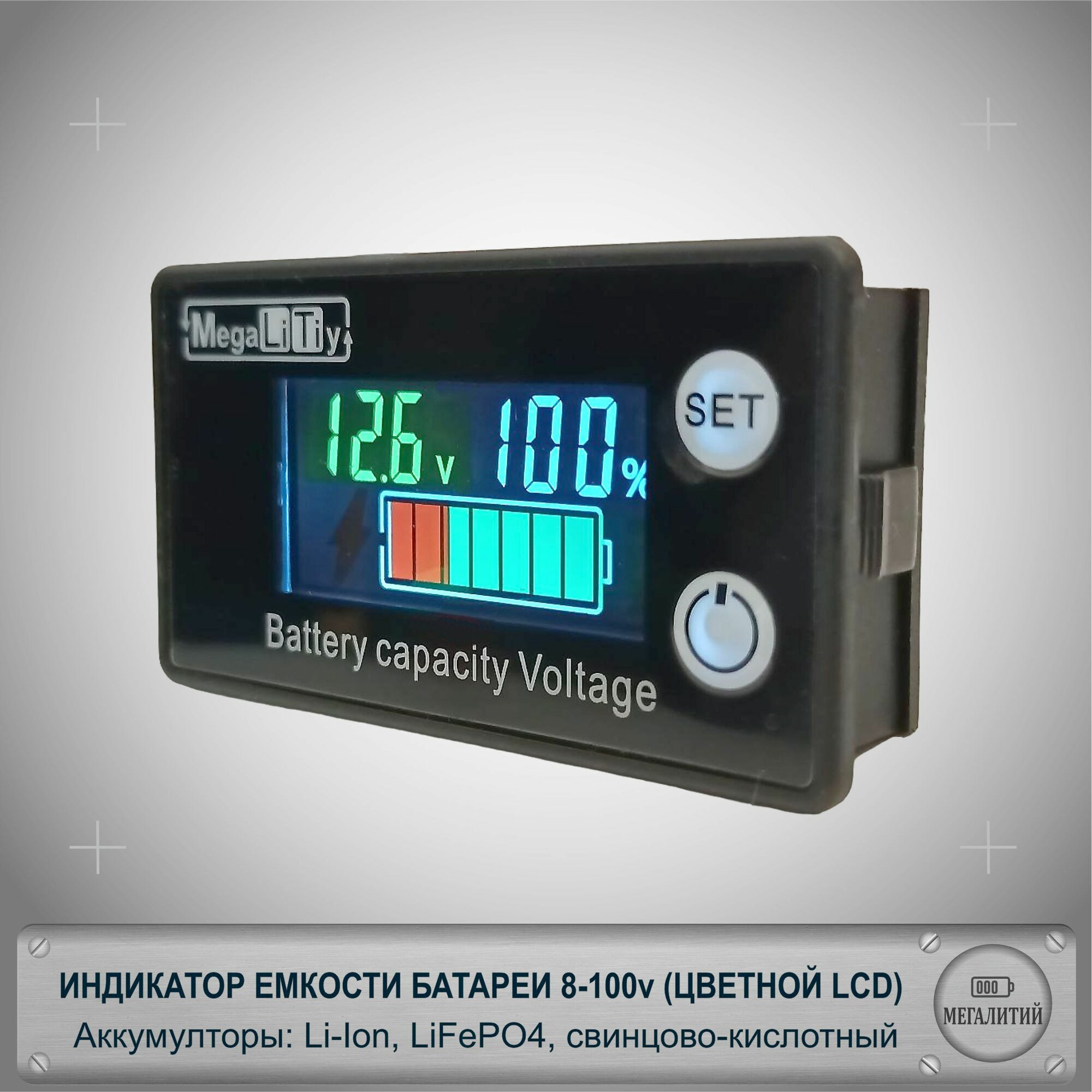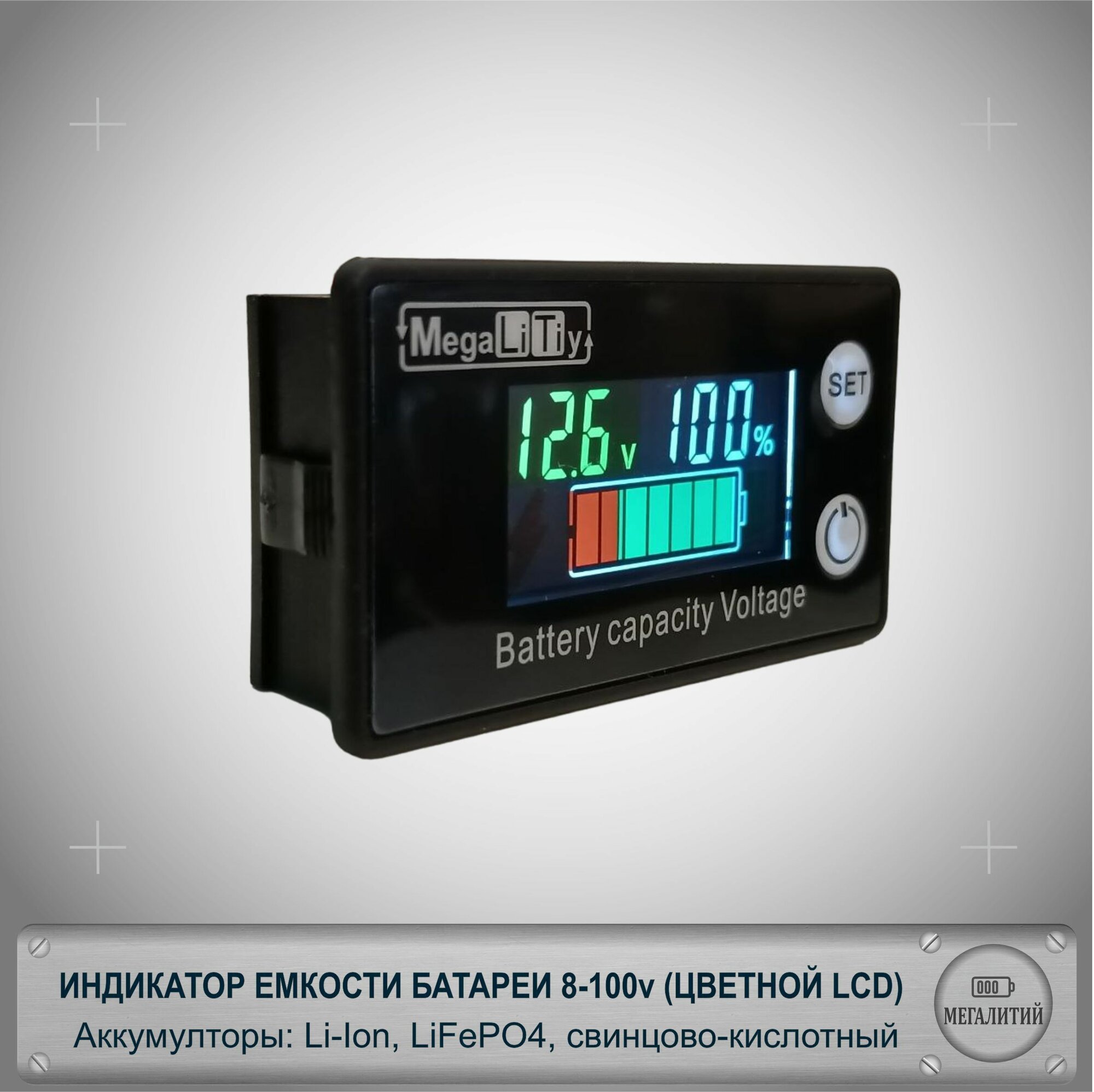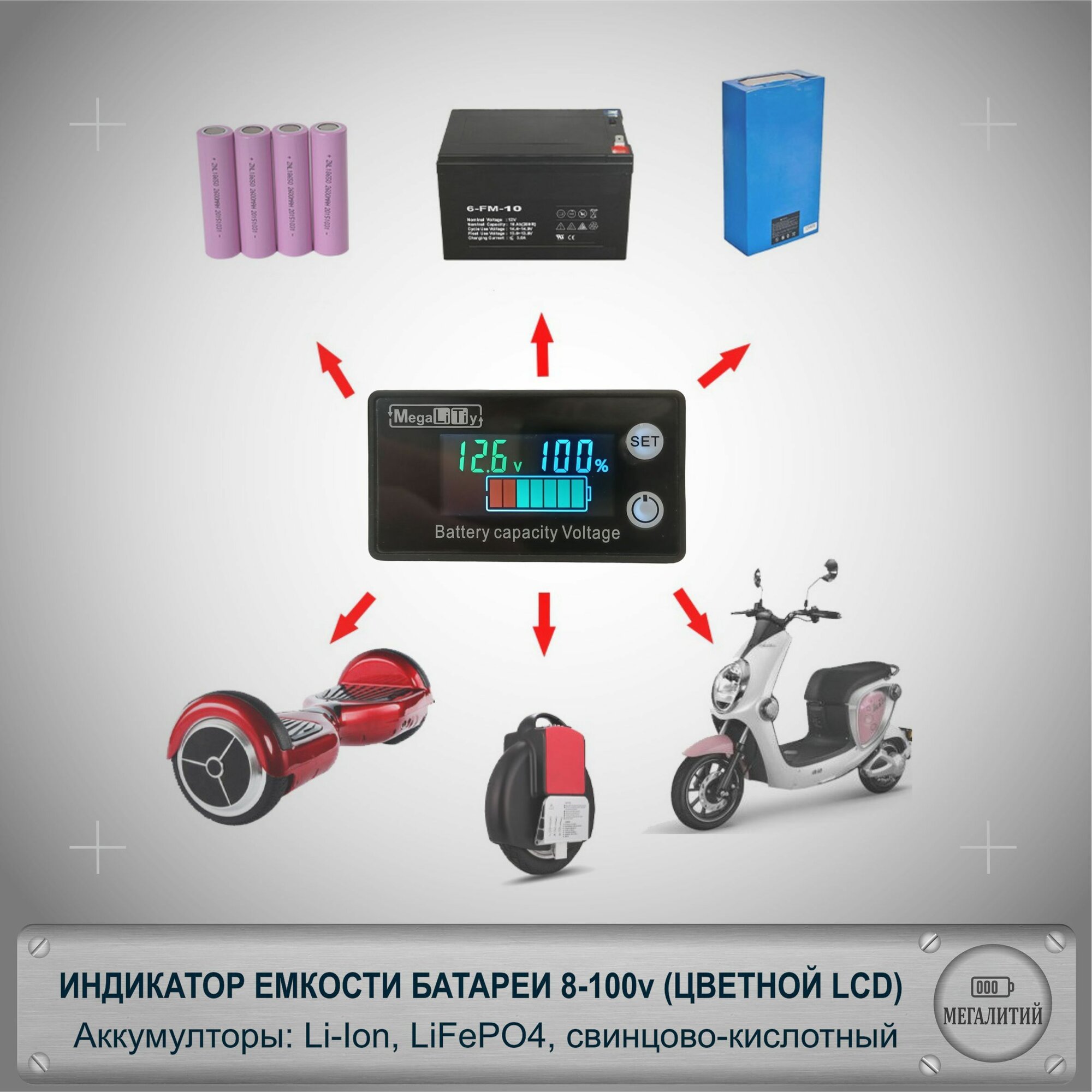Цифровой индикатор емкости батареи 8-100в цветной дисплей ( Li-ion, LiFePO4, кислотный аккумулятор), MEGALITIY интересное: