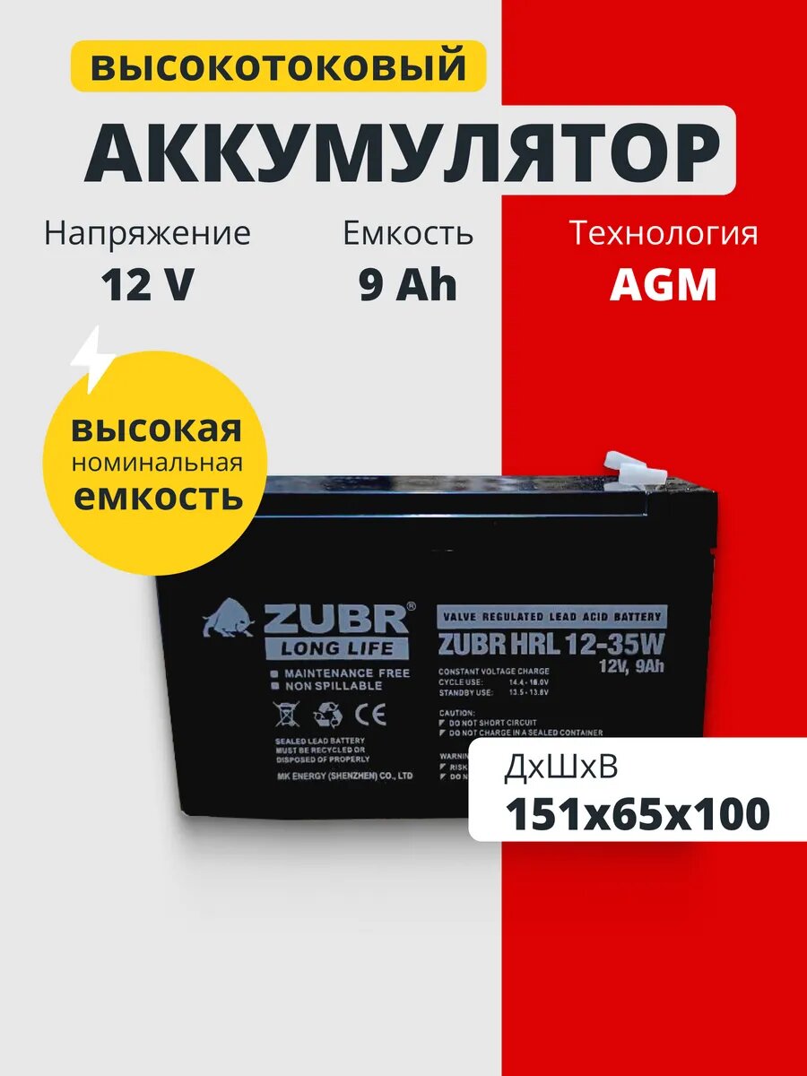 Аккумулятор для ибп 12v 9Ah ZUBR HRL12-35W AGM F2/T2 детских машинок, весов интересное: