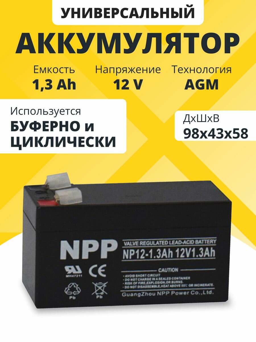 Аккумулятор 12v 1.3 Ah NPP AGM F1/T1 акб для эхолота, весов, игрушек 98x43x58 мм интересное: