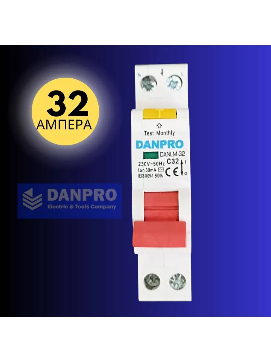 Дифференциальный автомат 32 Ампера, 2 полюса, ток утечки 30 мА, тип АС, бренд DANPRO интересное: