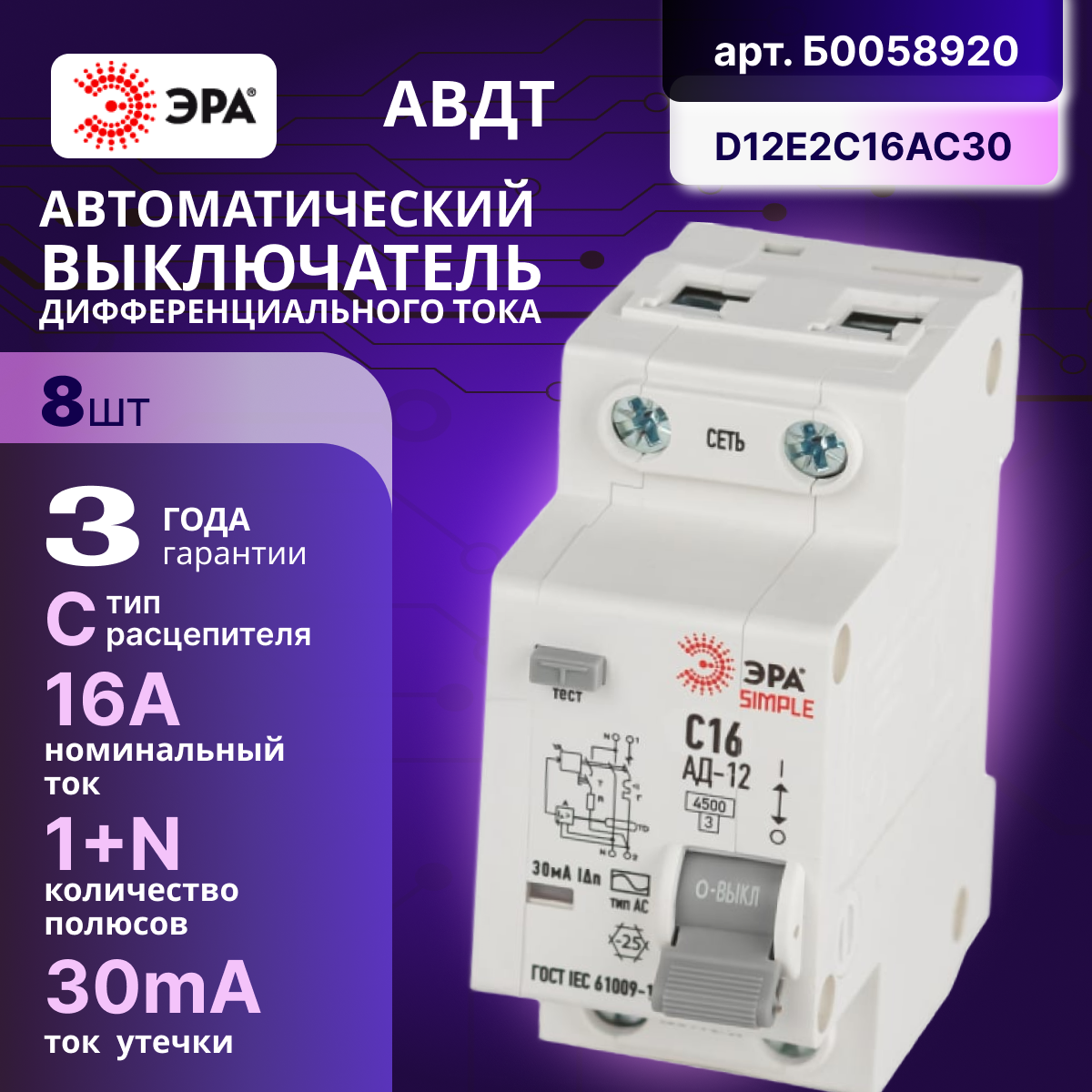 Автоматический выключатель дифференциального тока авдт 16а 30ма ЭРА SIMPLE D12E2C16AC30 АД-12 электронное 1P+N С16 тип АС 4,5кА