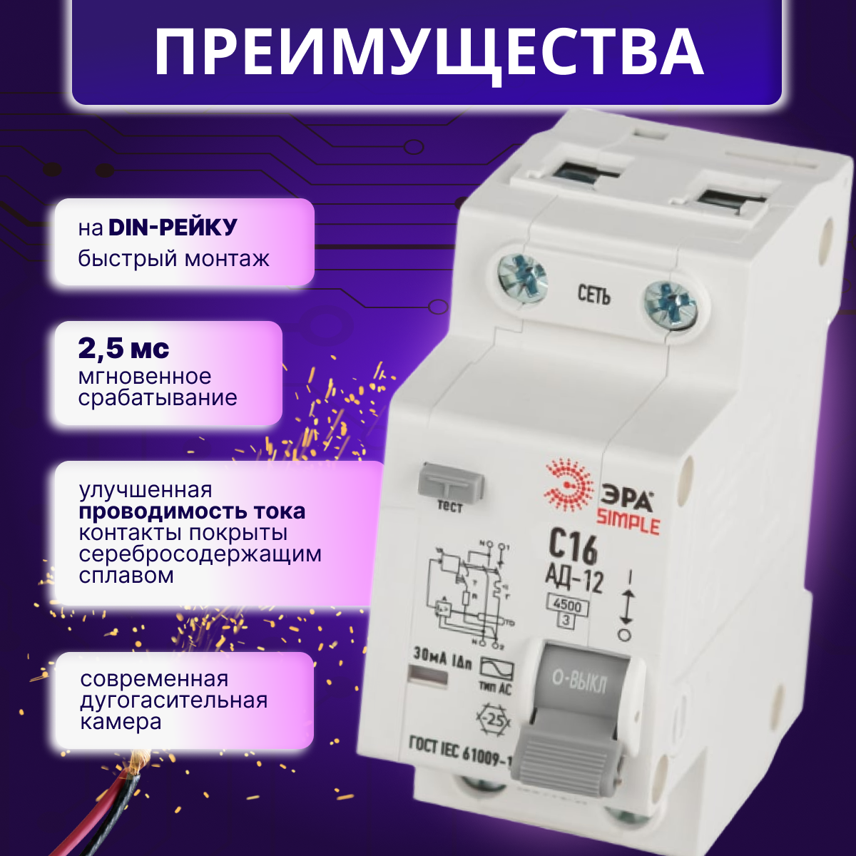Дифавтомат 2P (1П+N) 16А 4.5кА 30мА C AC SIMPLE D12E2C16AC30 АВДТ АД-12 Б0058920 ЭРА 6шт