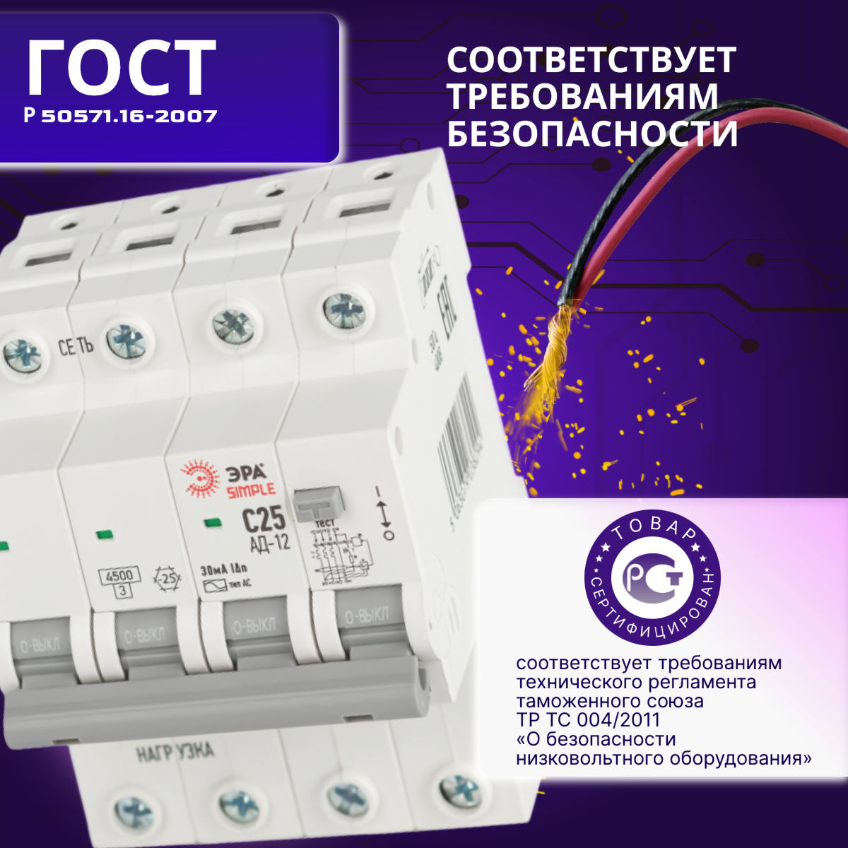 Дифавтомат 4P (3П+N) 25А 4.5кА 30мА C AC SIMPLE D12E4C25AC30 АВДТ АД-12 Б0058928 ЭРА 1шт интересное: