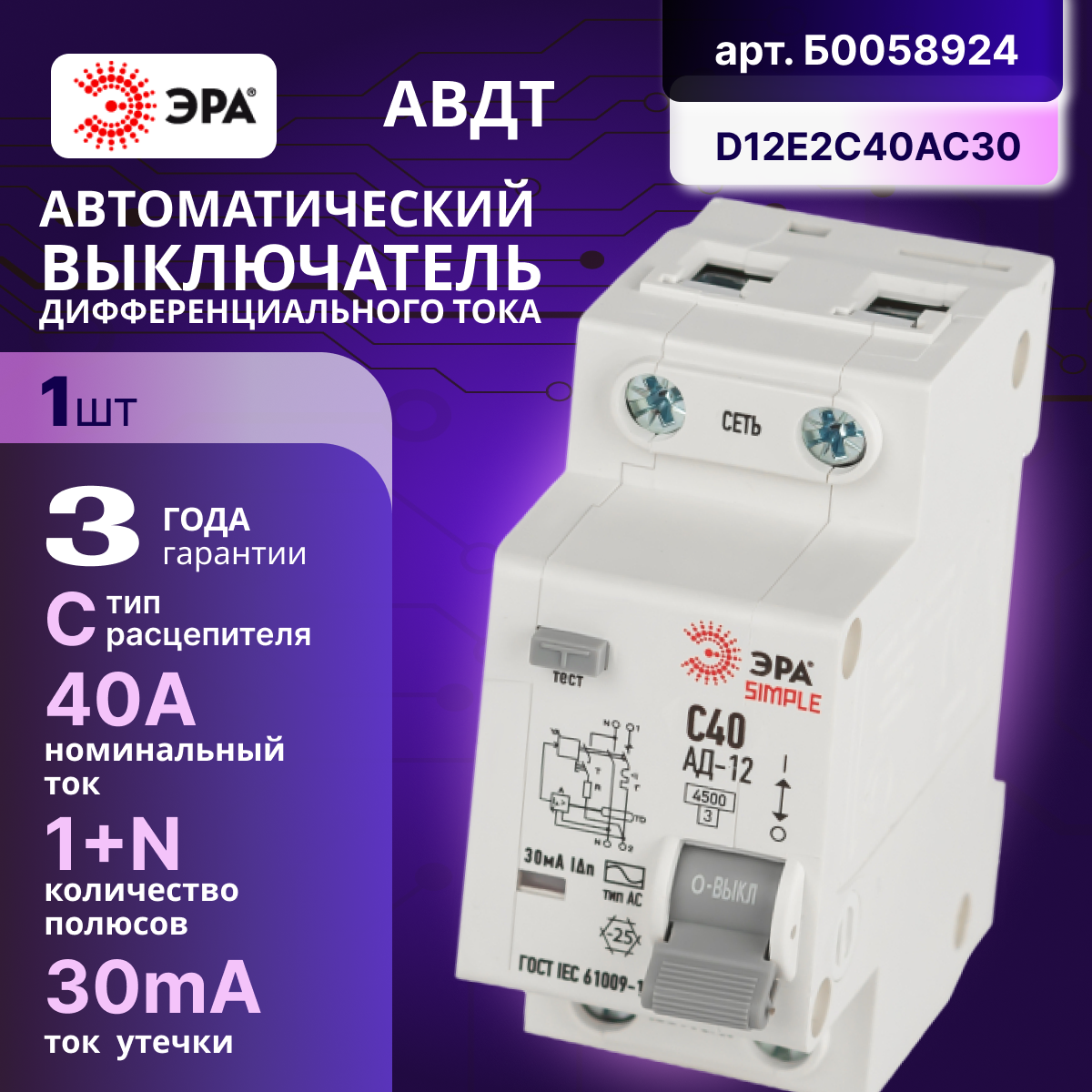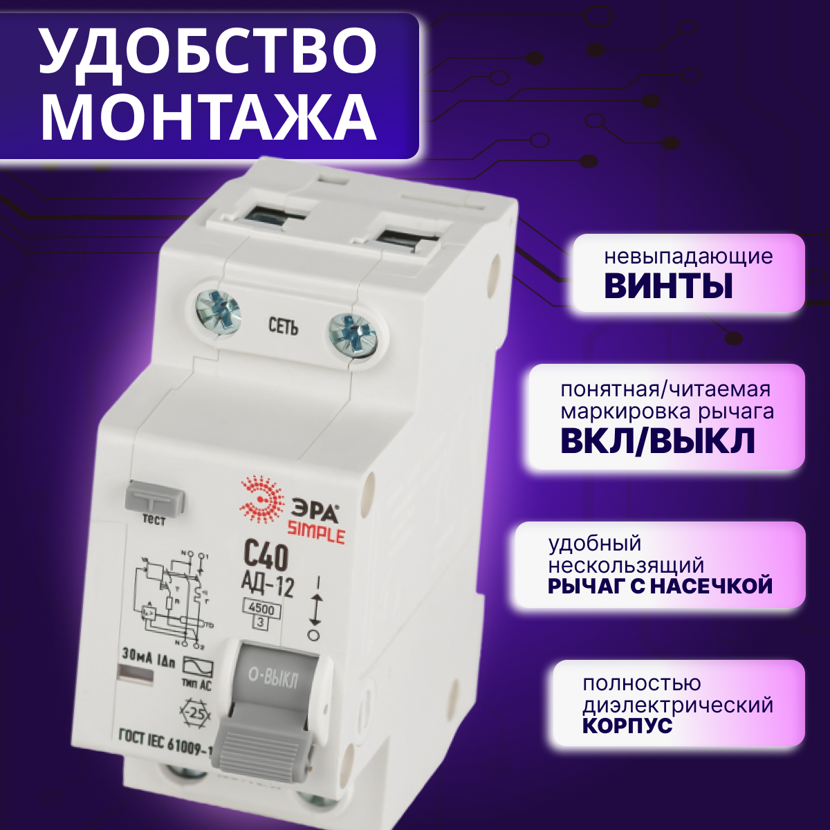 Дифавтомат 2P (1П+N) 40А 4.5кА 30мА C AC SIMPLE D12E2C40AC30 АВДТ АД-12 Б0058924 ЭРА 1шт интересное: