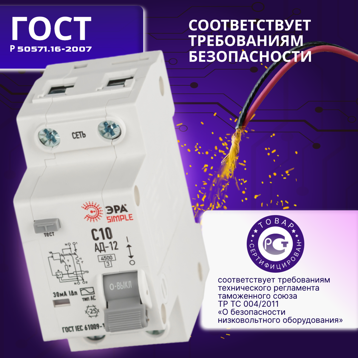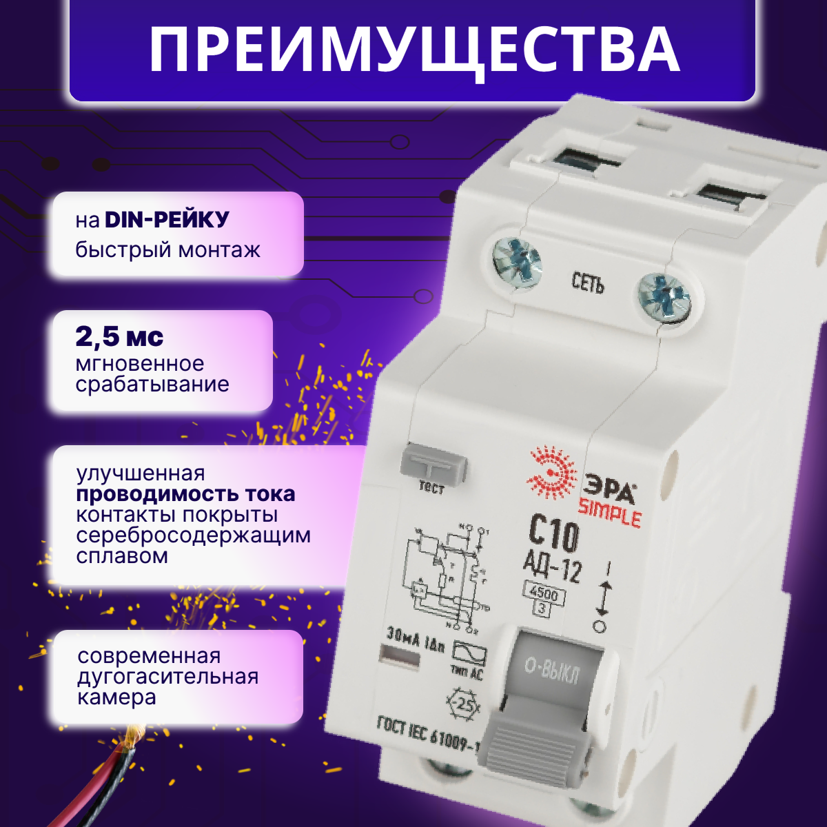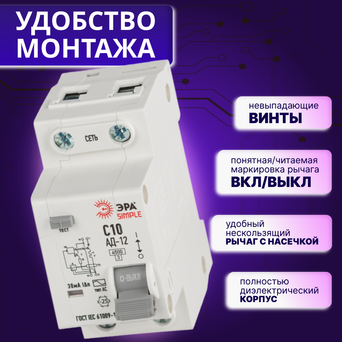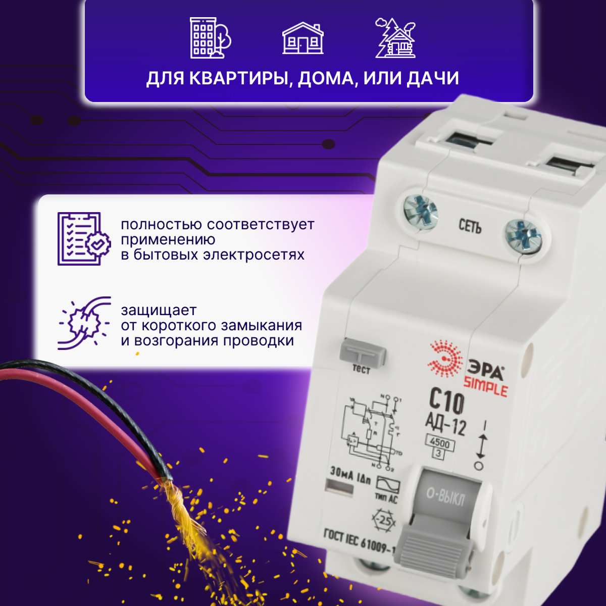 Дифавтомат 2P (1П+N) 10А 4.5кА 30мА C AC SIMPLE D12E2C10AC30 АВДТ АД-12 Б0058919 ЭРА 1шт интересное: