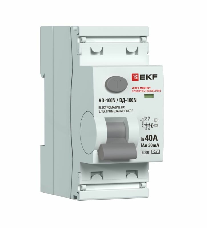 УЗО 16А, ток утечки 30мА, тип A, двухполюсное 2P, 6кА , EKF PROXIMA ВД-100N дифференциальный выключатель - устройство защитного отключения