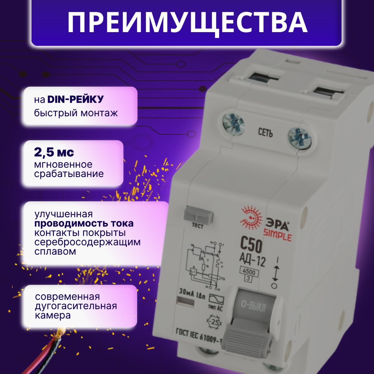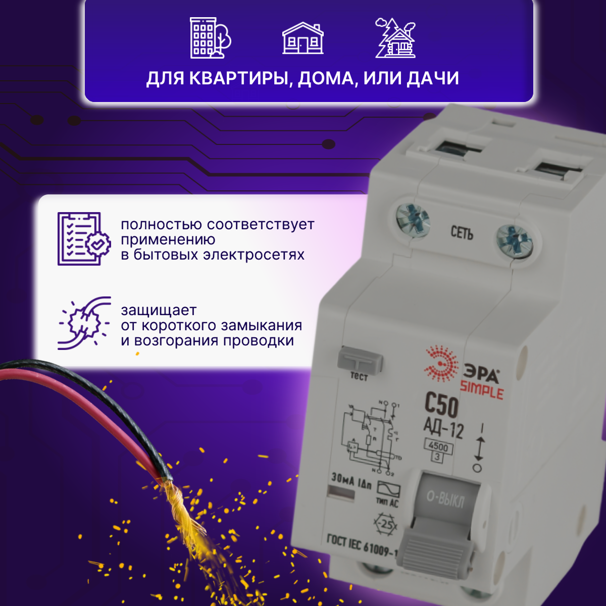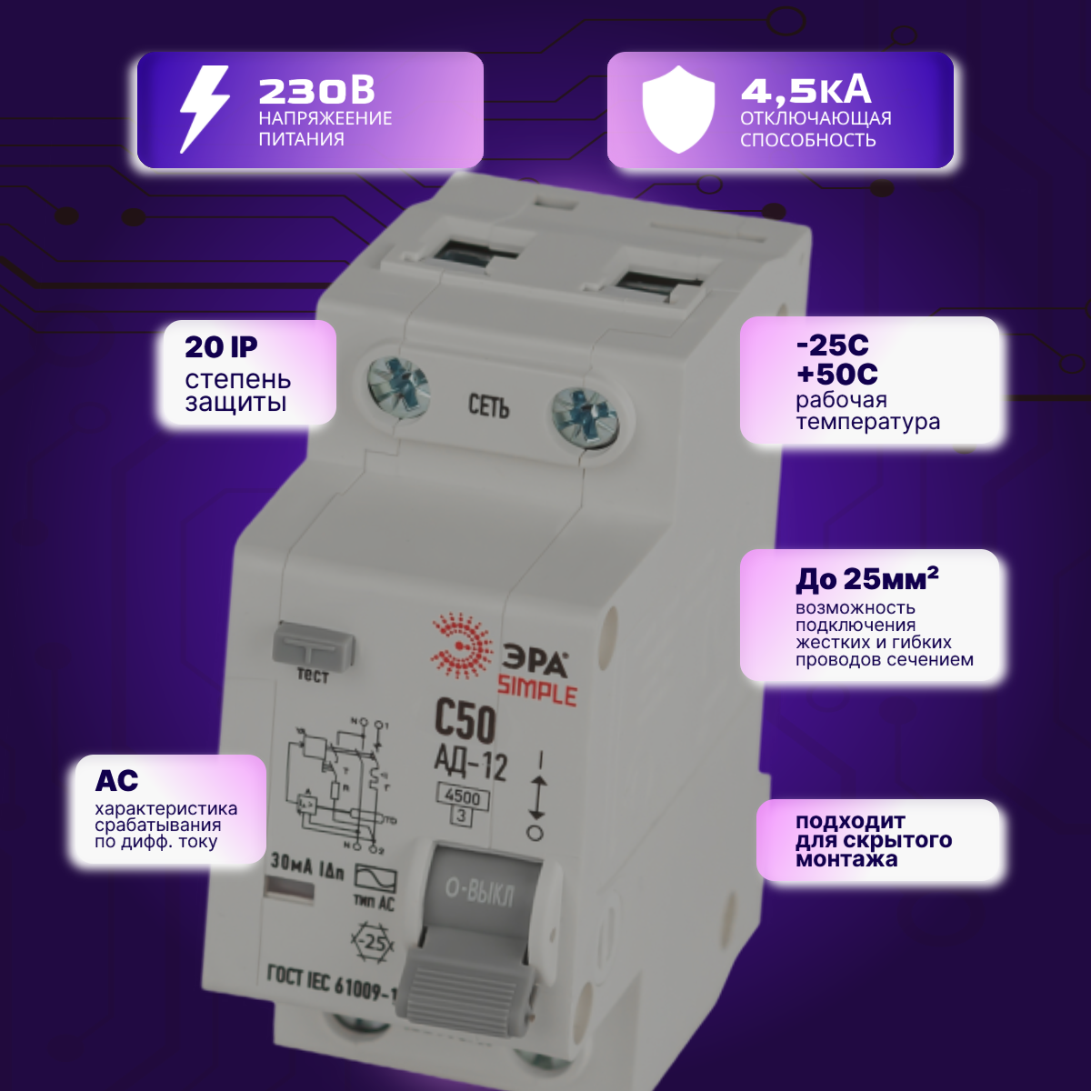Дифавтомат 2P (1П+N) 50А 4.5кА 30мА C AC SIMPLE D12E2C50AC30 АВДТ АД-12 Б0058925 Эра 2шт интересное:
