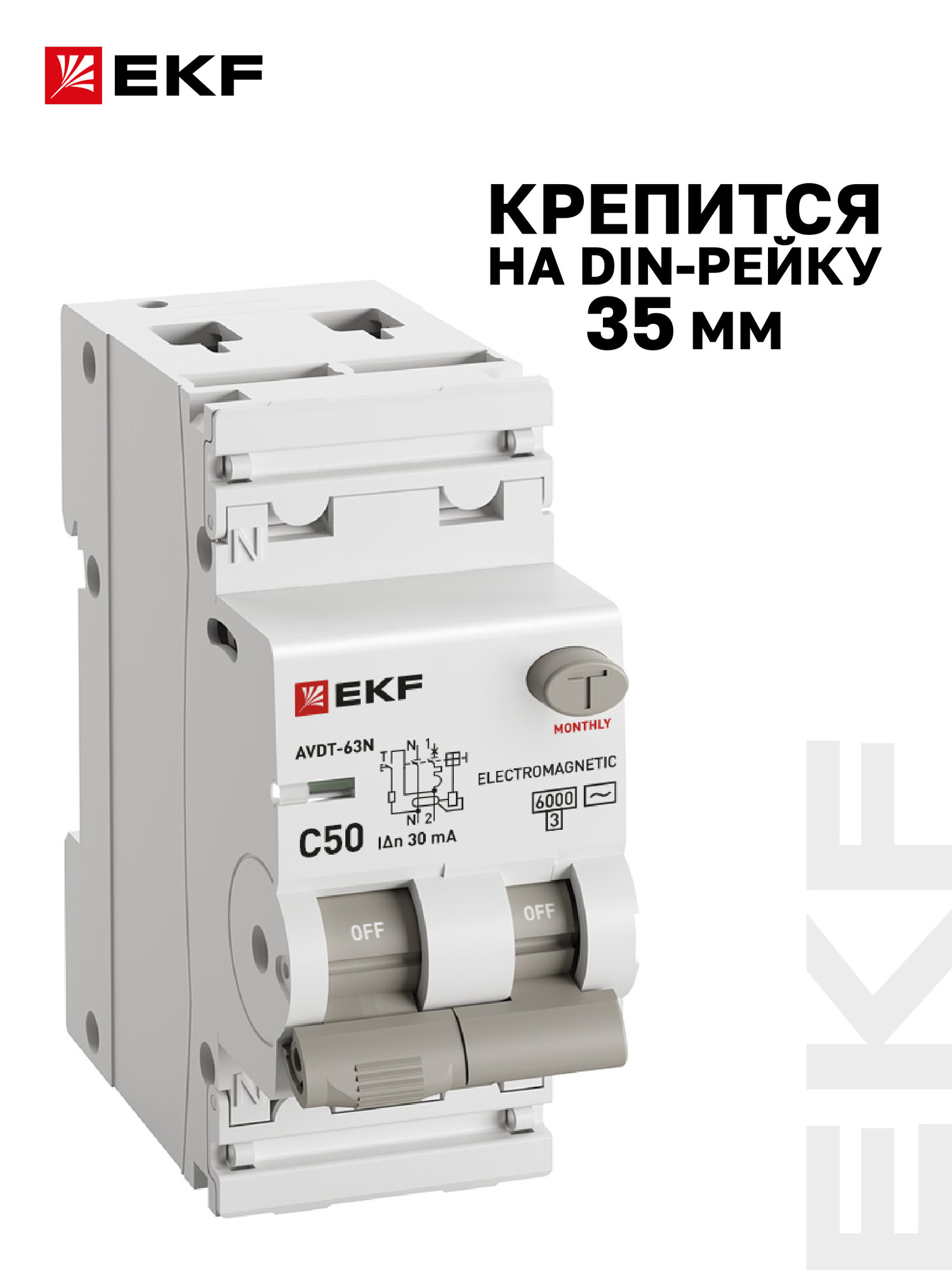 Купить Дифавтомат 50А (C) 30мА, тип AC, 1P+N (двухполюсный), 6кА, электромеханический АВДТ-63N EKF PROXIMA - Автоматический выключатель дифференциального тока