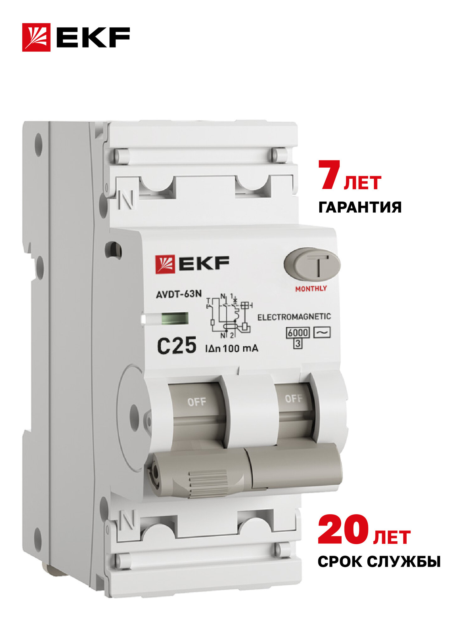 Дифавтомат 25А (C) 10мА, тип AC, 1P+N (двухполюсный), 6кА, электромеханический АВДТ-63N EKF PROXIMA - Автоматический выключатель дифференциального тока