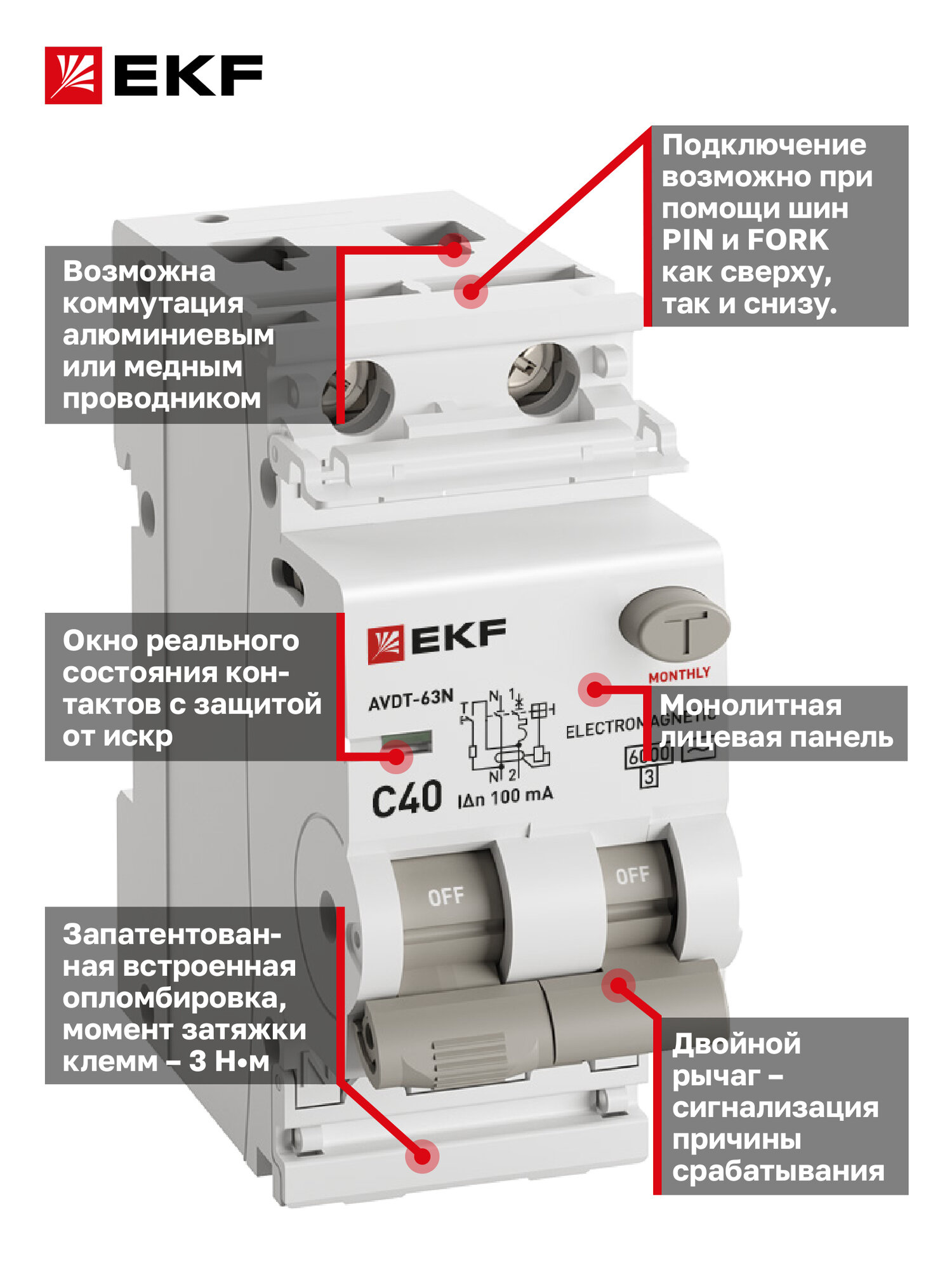 СохранитьДифавтомат 40А (C) 100мА, тип AC, 1P+N (двухполюсный), 6кА, электромеханический АВДТ-63N EKF PROXIMA - Автоматический выключатель дифференциального тока интересное: