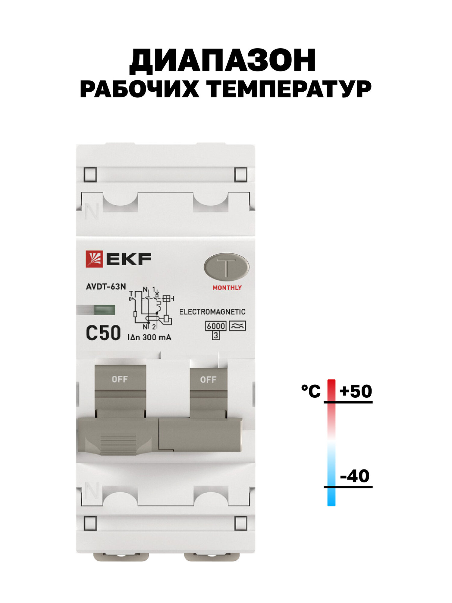 Купить Дифавтомат 50А (C) 300мА, тип A, 1P+N (двухполюсный), 6кА, электромеханический АВДТ-63N EKF PROXIMA - Автоматический выключатель дифференциального тока