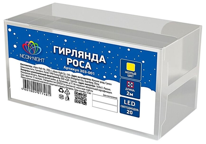 Гирлянда светодиодная Роса 2м, 20LED, белый, IP20, тонкий батарейный блок, 2хCR2032 в комплекте NEON-NIGHT 1 шт арт. 303-005