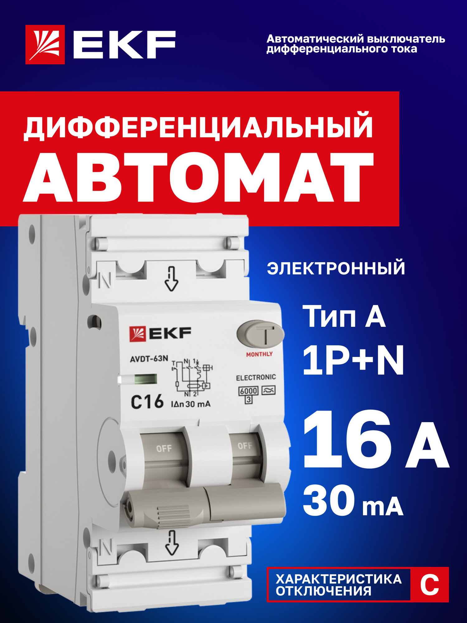 СохранитьДифавтомат 16А (C) 30мА, тип A, 1P+N (двухполюсный), 6кА, электронный АВДТ-63N EKF PROXIMA - Автоматический выключатель дифференциального тока интересное: