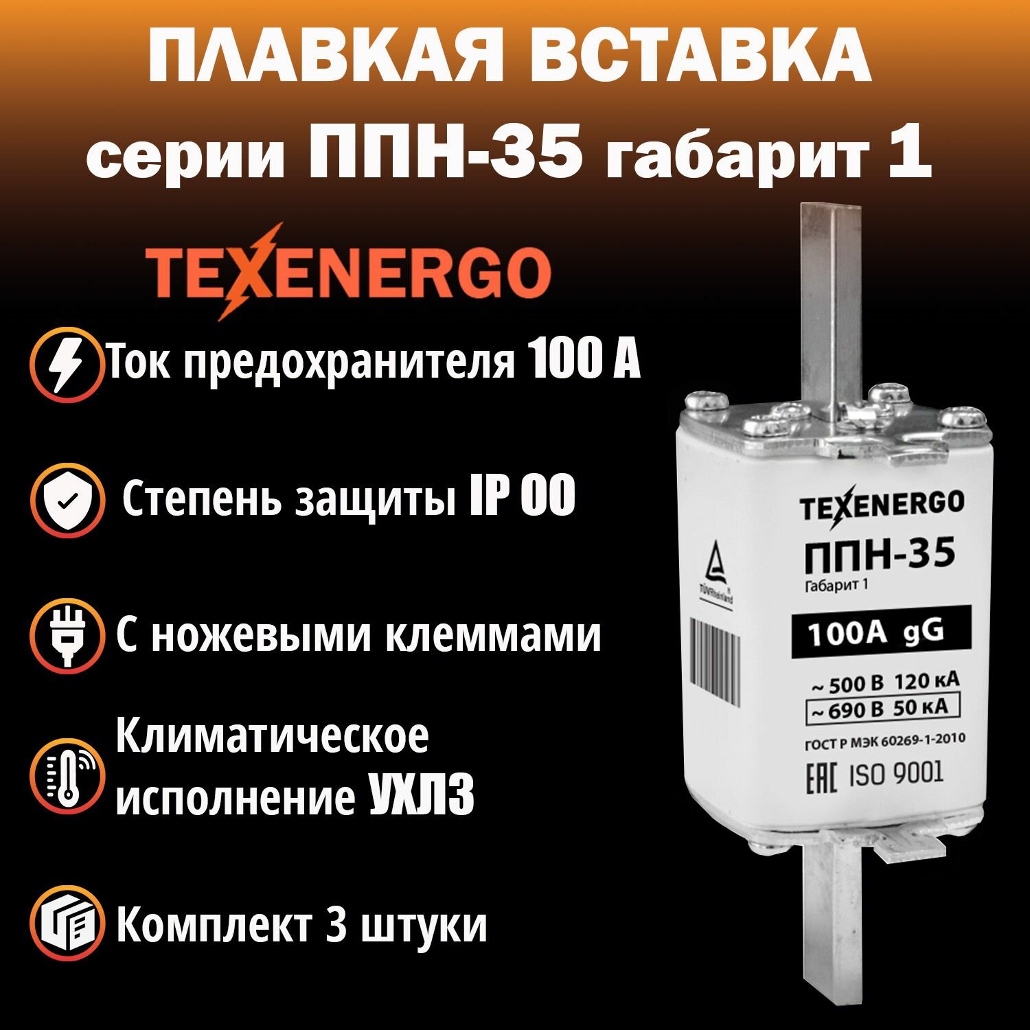 Купить Плавкая вставка(предохранитель) ППН-35 100А габарит 1 Texenergo (комплект 3 шт.)