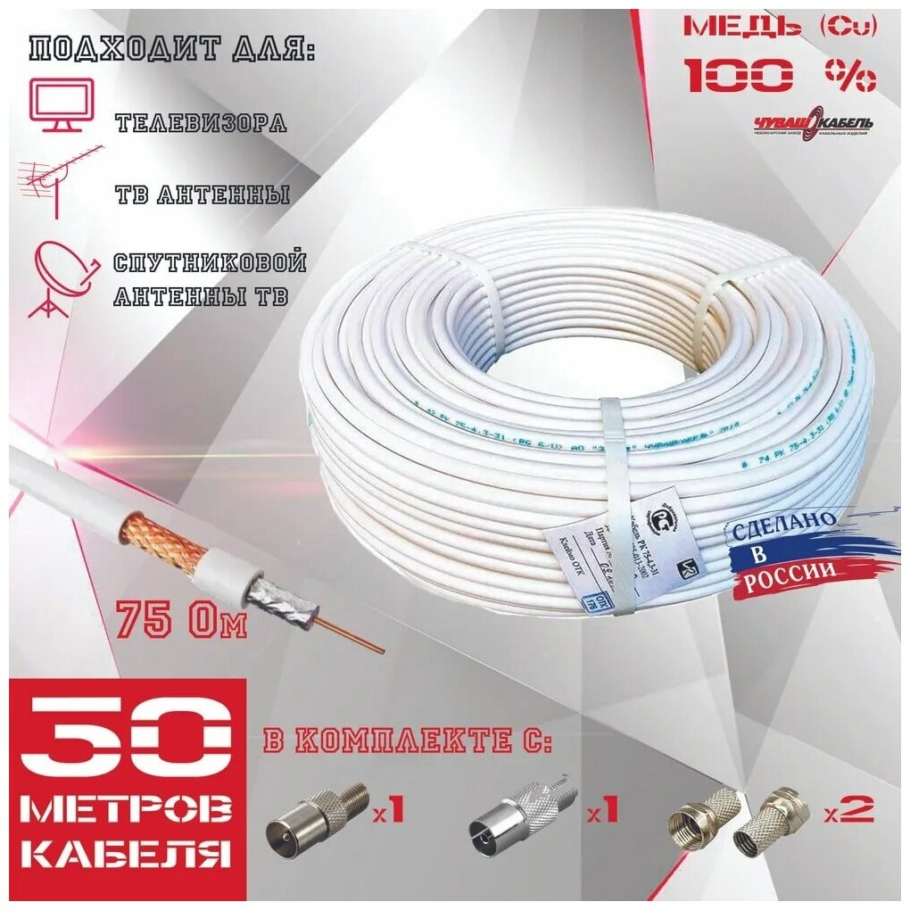 Высококачественный внутренний коаксиальный (антенный телевизионный) кабель РК 75-4,3-31 для передачи видео 50 метров