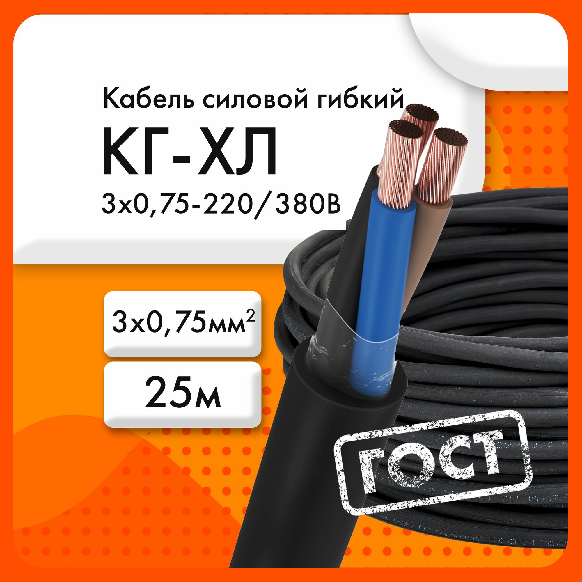 Купить Кабель гибкий ЭКЗ КГ-ХЛ 3х0,75 220/380В-3(ГОСТ 24334-2020)(бухта 25 м)