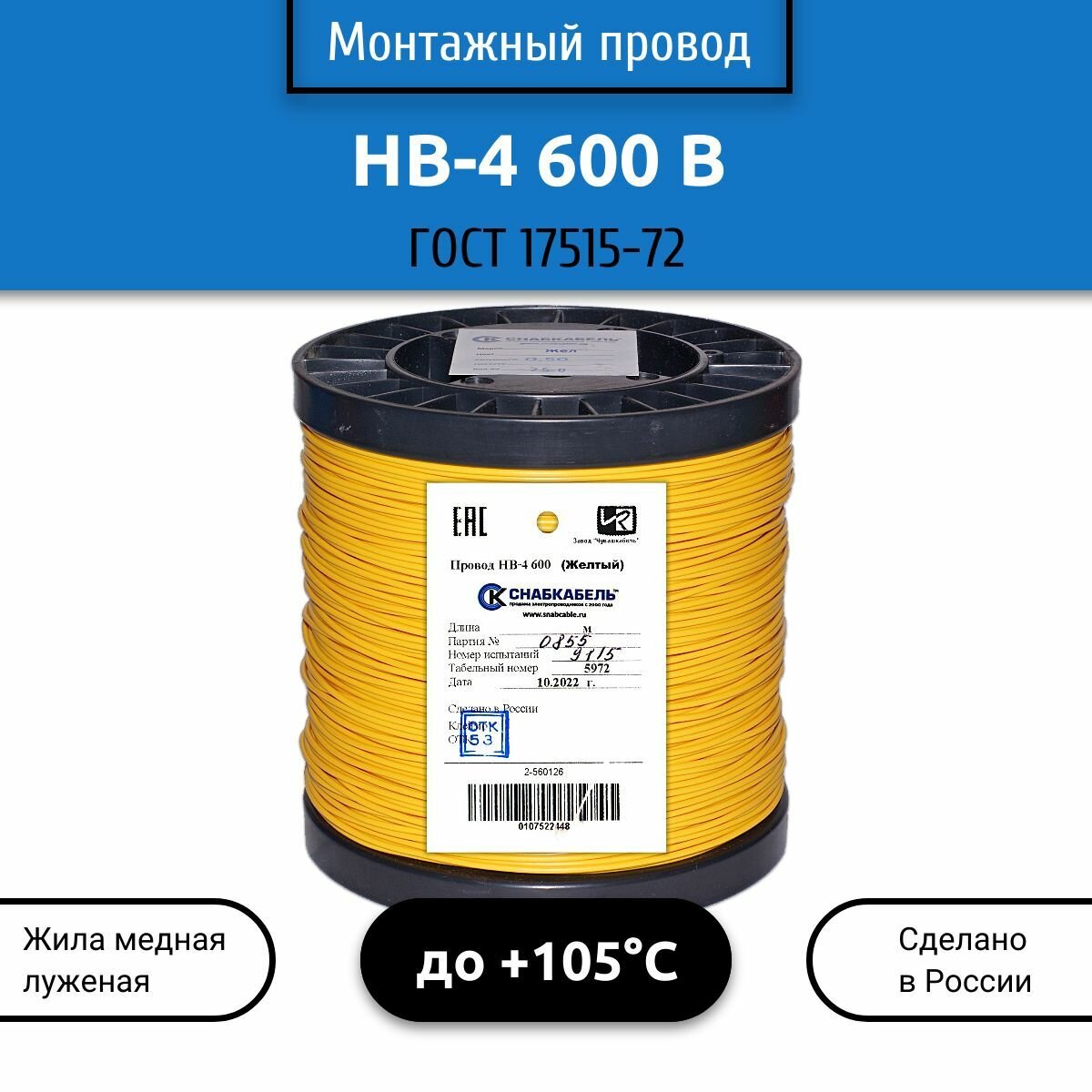 Электрический провод НВ 0,50мм2 4х600В 200 м желтый на катушке