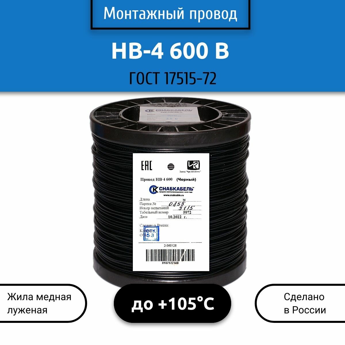 Электрический провод НВ 0,75мм2 4х600В 200 м черный на катушке