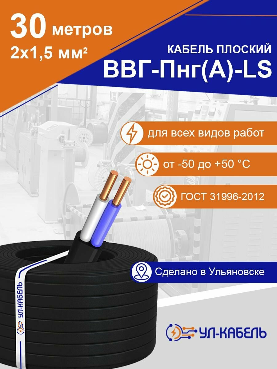 Кабель плоский ВВГ-Пнг(А)-LS 2 x 1.5 мм , 20 м ГОСТ (УЛ-КАБЕЛЬ)
