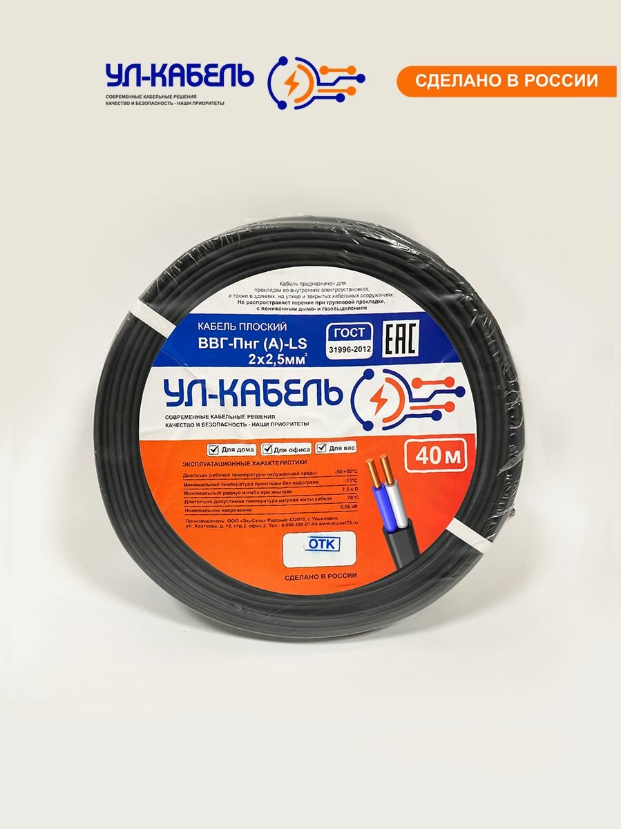 Купить Кабель плоский ВВГ-Пнг(А)-LS 2 x 2.5 мм , 40 м ГОСТ (УЛ-КАБЕЛЬ)