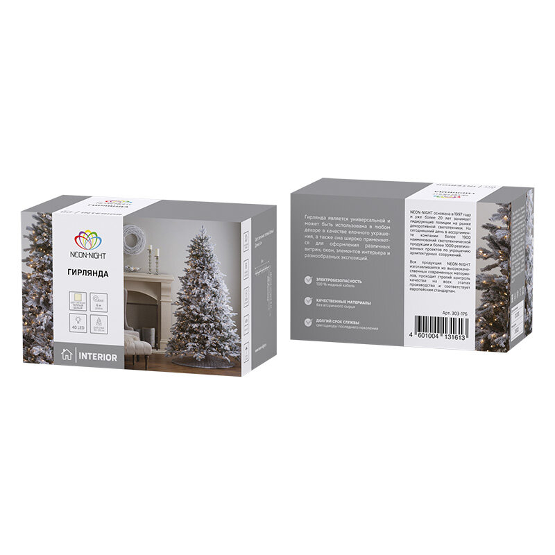Электрогирлянда новогодняя NEON-NIGHT 303-186, 10 м, 80 ламп, теплый белый