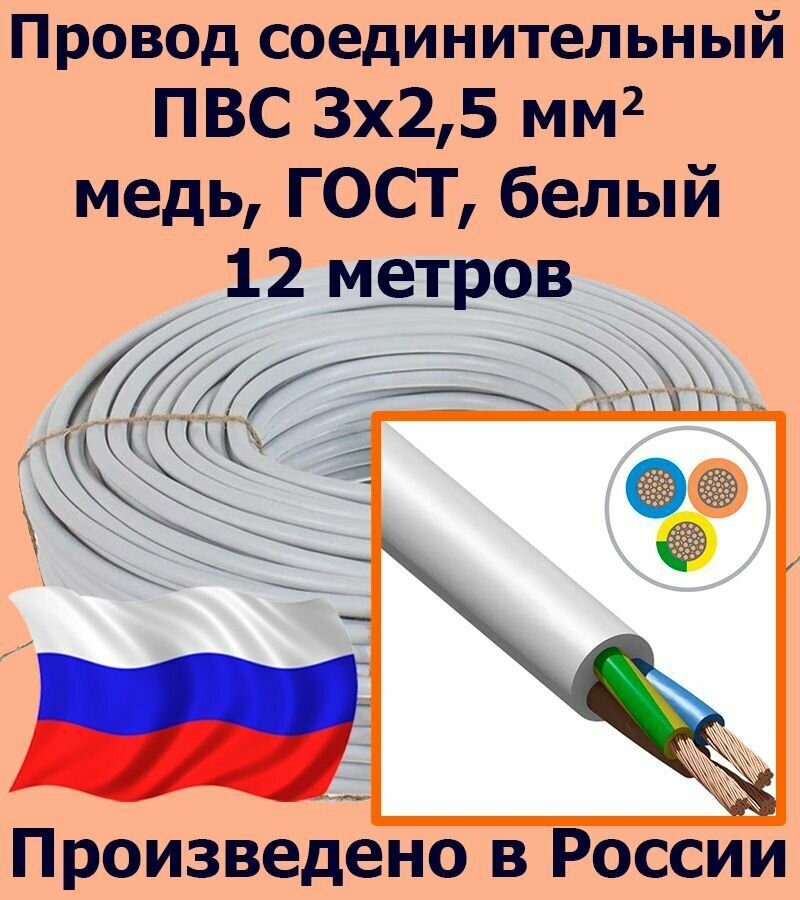 Купить Провод соединительный ПВС 3х2,5 мм2, белый, медь, ГОСТ, 12 метров