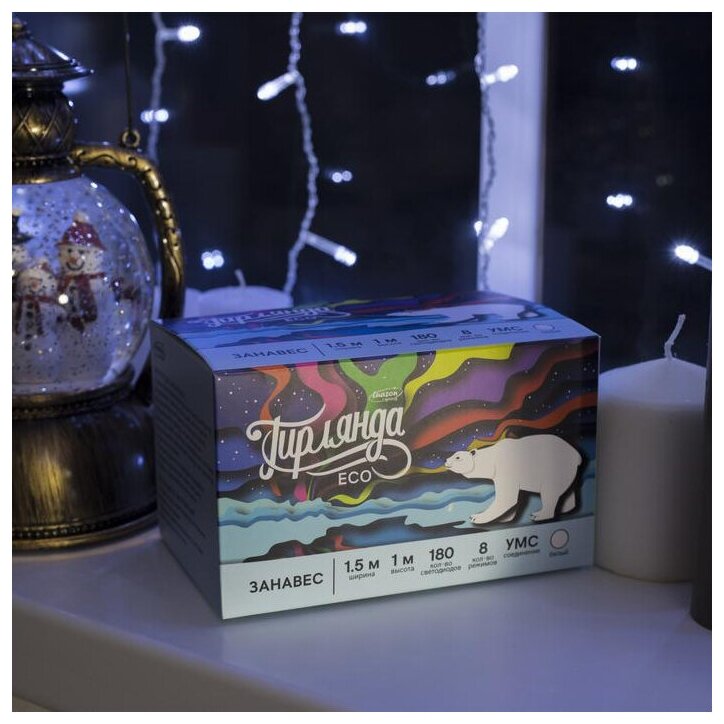 Гирлянда "Занавес" 1.5 х 1 м , IP20, прозрачная нить, 180 LED, свечение белое, 8 режимов, 220 В 1080