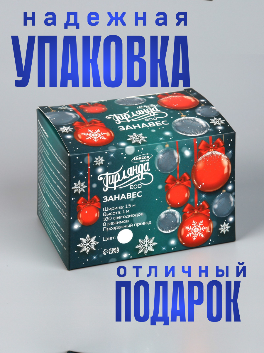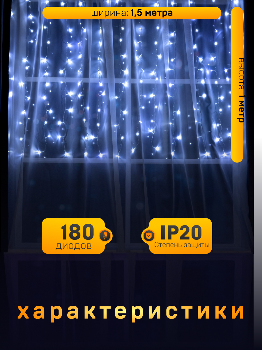 Купить Гирлянда "Занавес" 1.5 х 1 м , IP20, прозрачная нить, 180 LED, свечение белое, 8 режимов, 220 В 1080