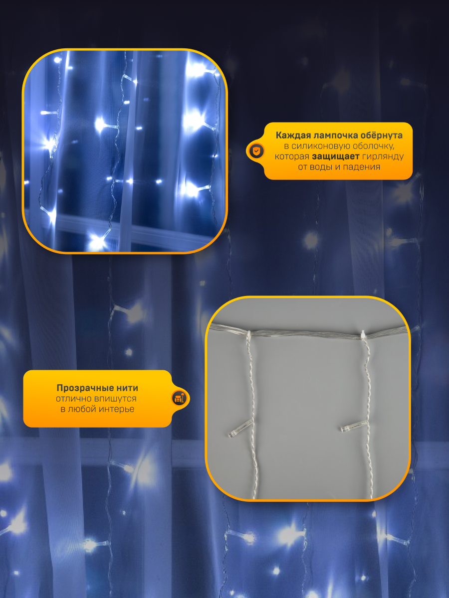 Гирлянда "Занавес" 1.5 х 1 м , IP20, прозрачная нить, 180 LED, свечение белое, 8 режимов, 220 В