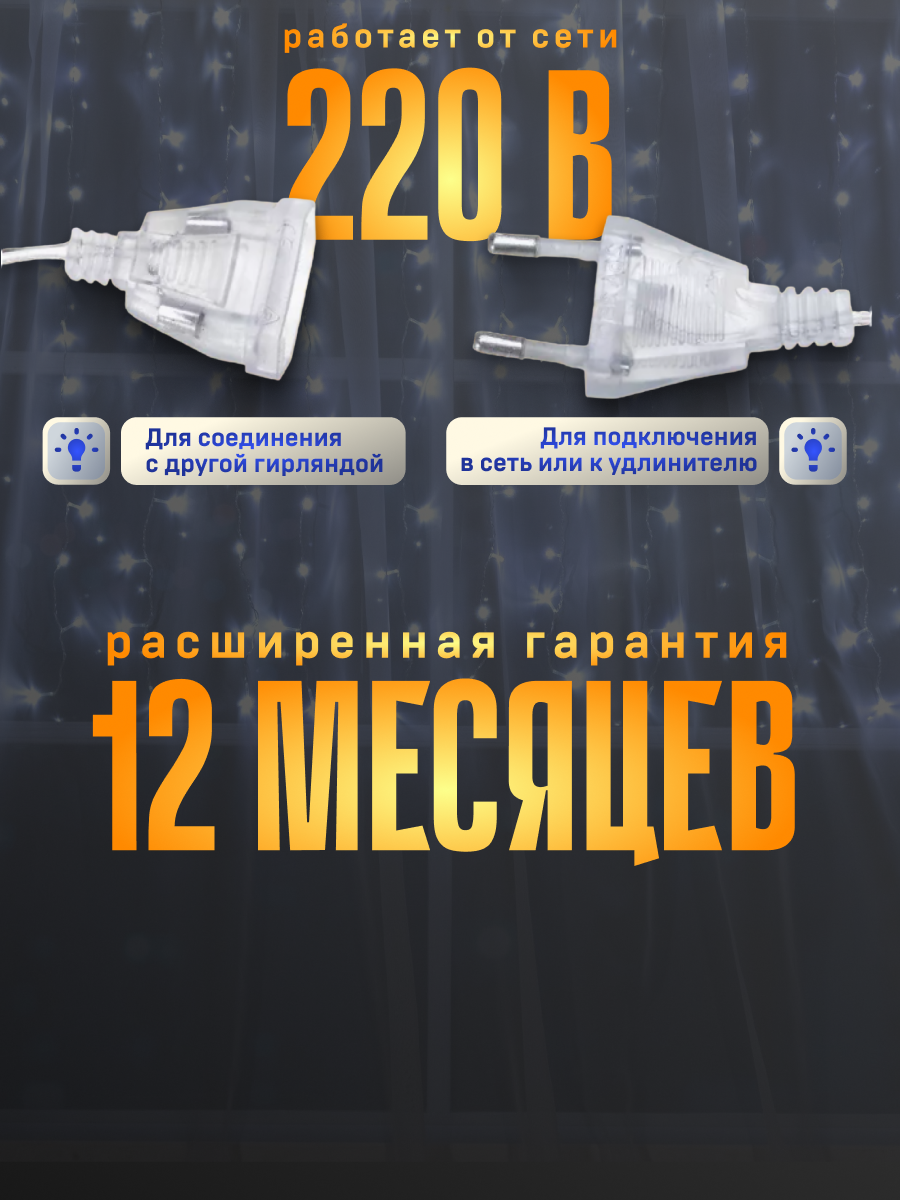 Занавес, УМС вилка, Ш:1.5 м, В:1 м, Н.С. LED-180-220V, 8 режимов, белый