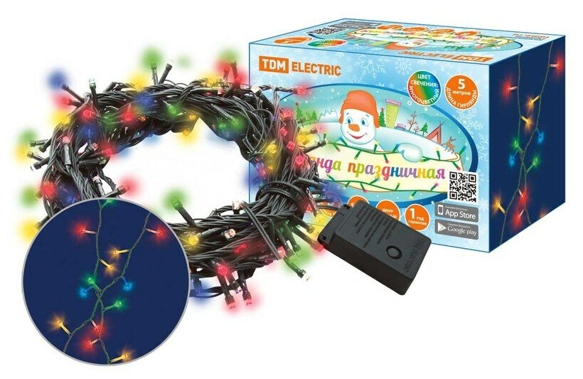 Светодиодная гирлянда TDM ELECTRIC светодиодная СГ50MЗ5, многоцвет., зеленый шнур, 5м, 8 режимов, 250 В