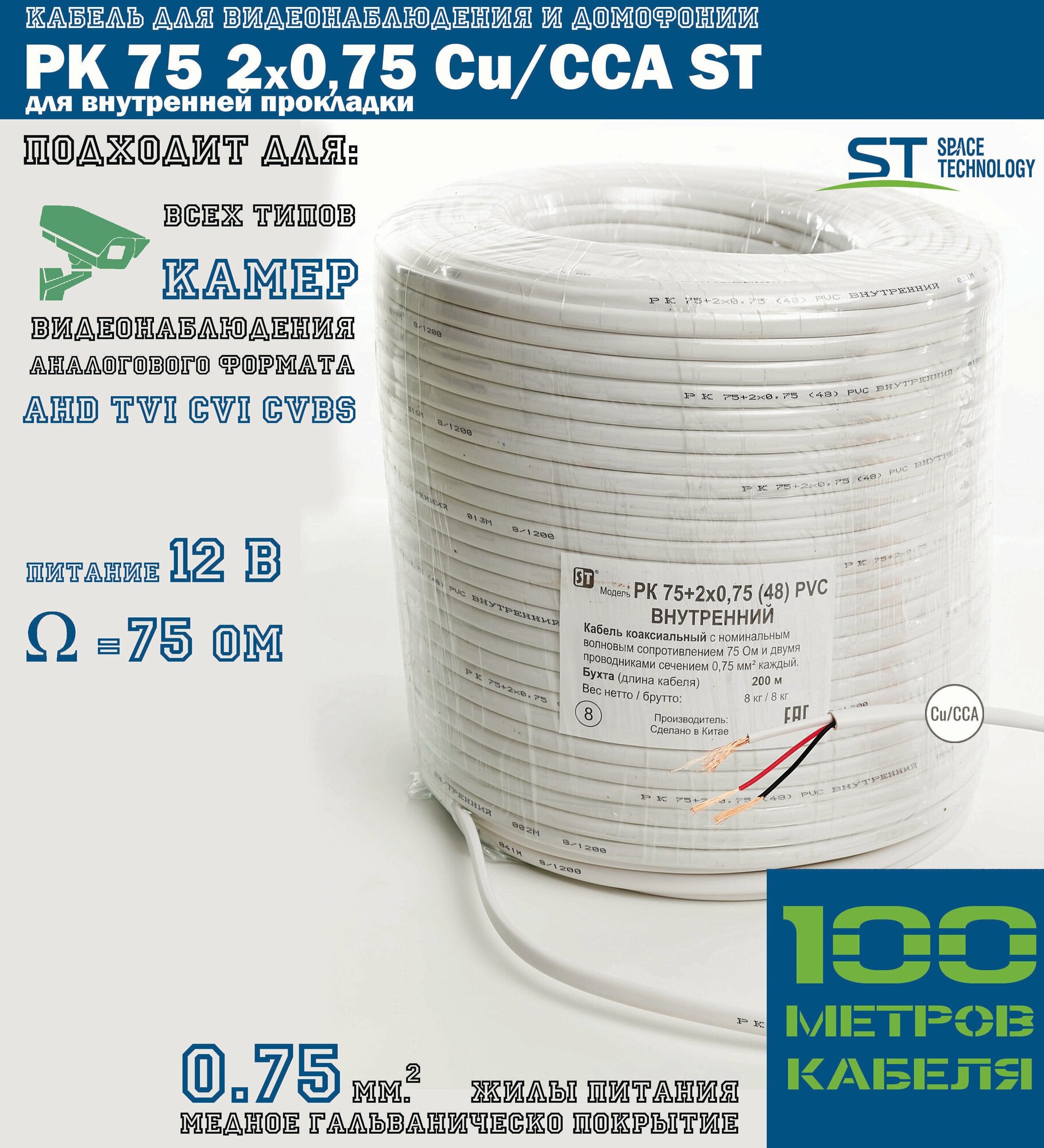 Кабель комбинированный для видеонаблюдения и домофонии КВК-В 2Х0,75 (РК 75+2х0,75 (48) PVC ST) белый для внутренней прокладки (помещение) (бухта 200м)