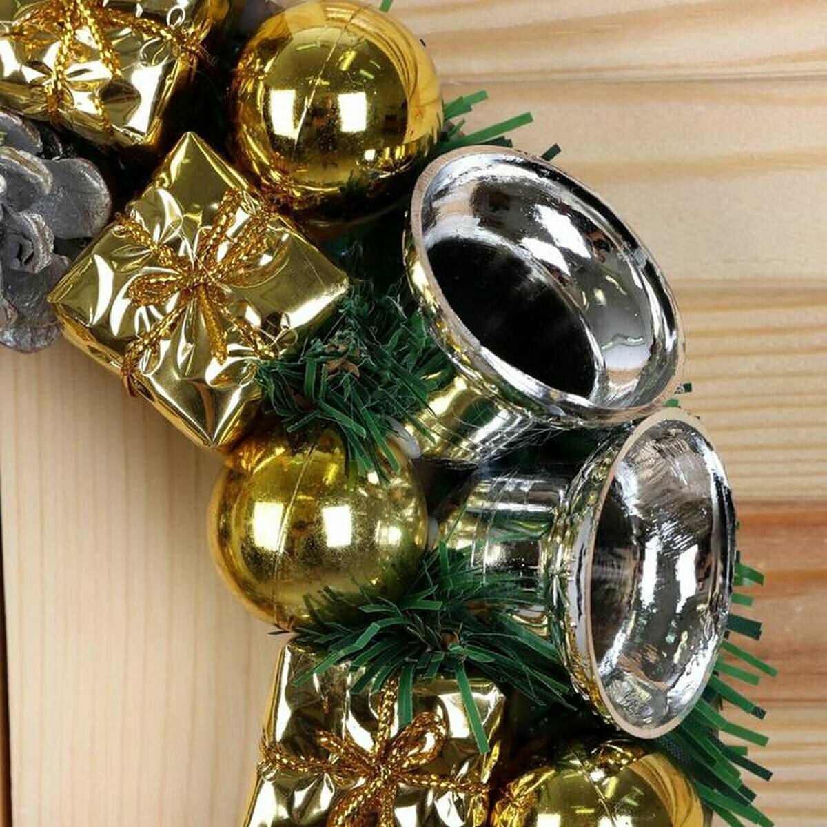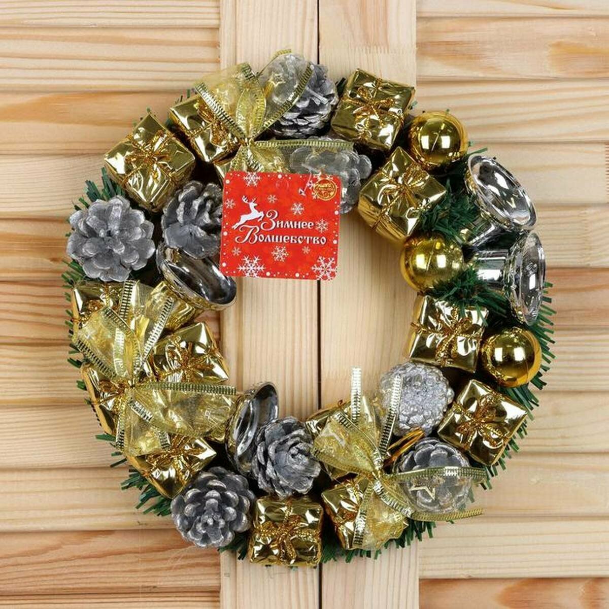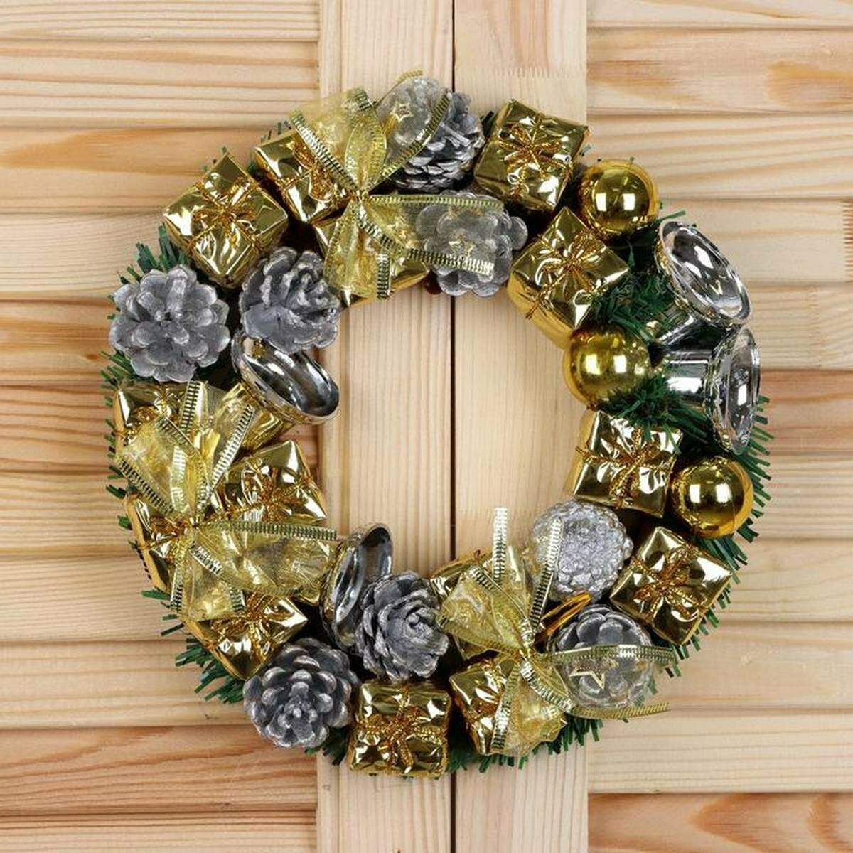 Венок новогодний Зимнее волшебство d-22 см с серебряными подарками и колокольчиками (2372211)
