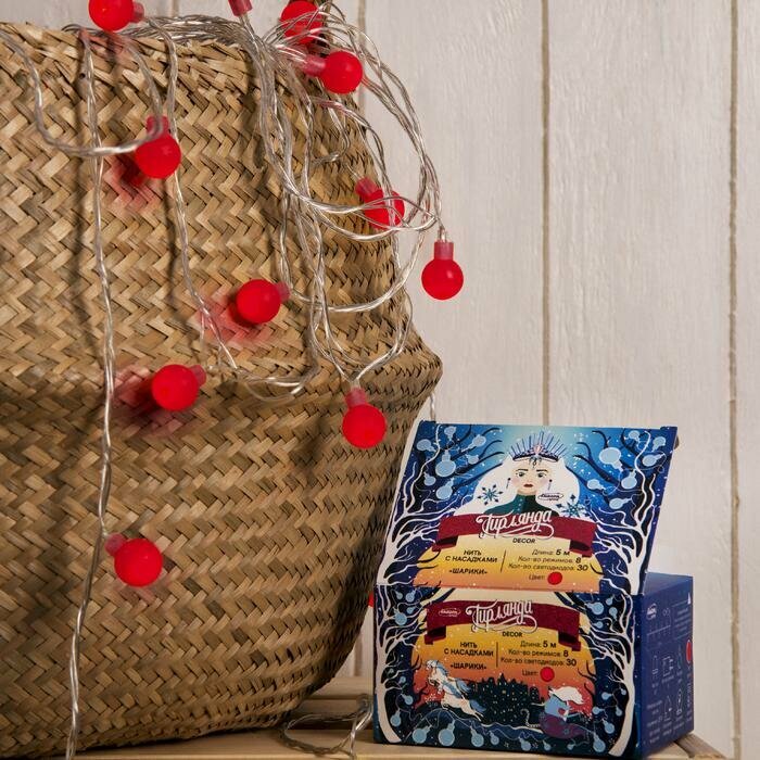 Комнатные гирлянды Luazon Lighting Гирлянда «Нить» 5 м с насадками «Шарики красные», IP20, прозрачная нить, 30 LED, свечение красное, 8 режимов, 220 В