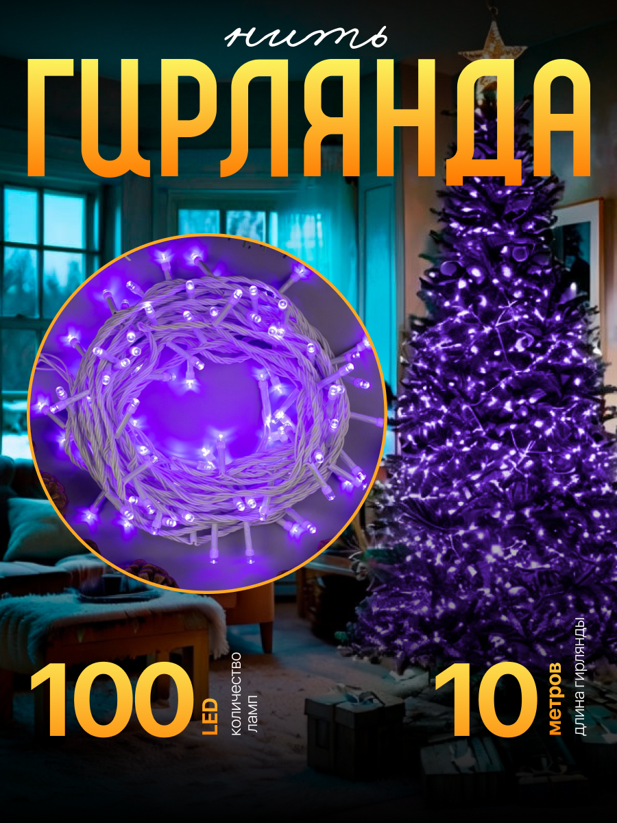 Комнатные гирлянды Luazon Lighting Гирлянда «Нить» 10 м, IP20, белая нить, 100 LED, свечение фиолетовое, 8 режимов, 220 В