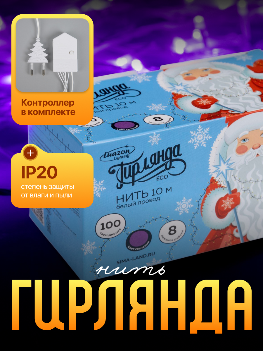 Luazon Lighting Гирлянда «Нить» 10 м, IP20, белая нить, 100 LED, свечение фиолетовое, 8 режимов, 220 В