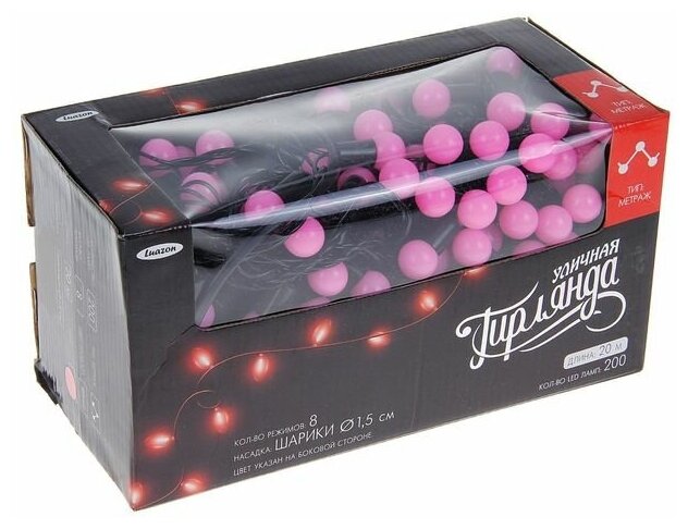 Уличные гирлянды Luazon Lighting Гирлянда «Нить» 20 м с насадками «Шарики 1.5 см», IP44, тёмная нить, 200 LED, свечение розовое, 8 режимов, 220 В