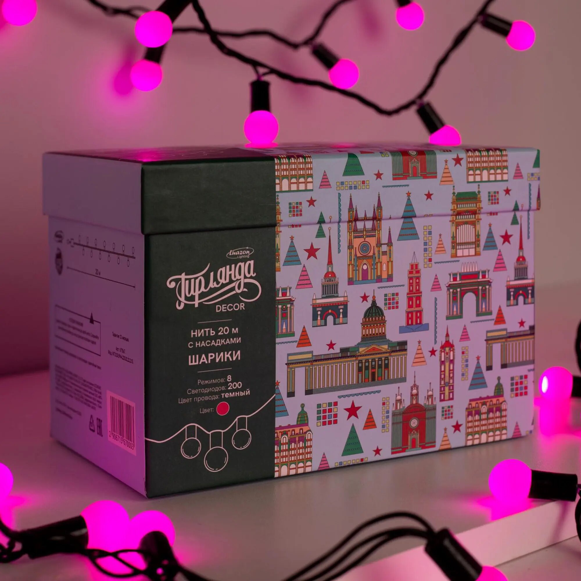 Уличные гирлянды Luazon Lighting Гирлянда «Нить» 20 м с насадками «Шарики 1.5 см», IP44, тёмная нить, 200 LED, свечение розовое, 8 режимов, 220 В