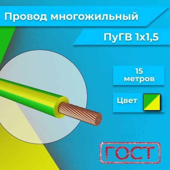 Купить Провод электрический многожильный ПУГВ ПВ3, 450В, 1х1.5 желто-зеленый 15м