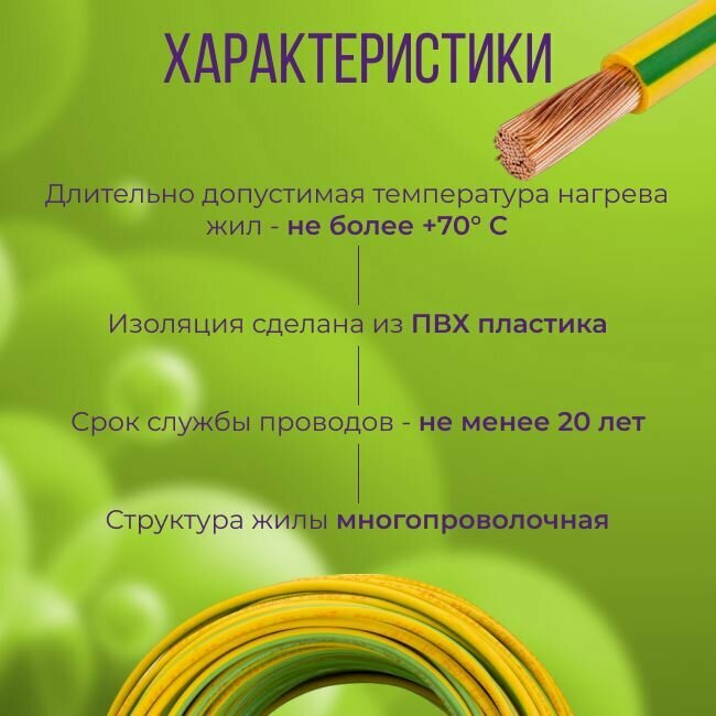 Провод электрический многожильный ПУГВ ПВ3, 750В, 1х70 желто-зеленый 6м