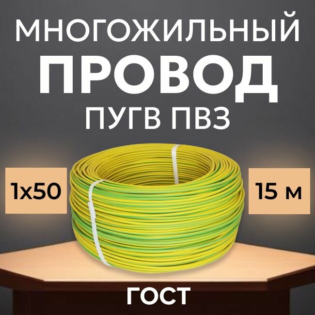 Купить Провод электрический многожильный ПУГВ ПВ3, 750В, 1х50 желто-зеленый 15м