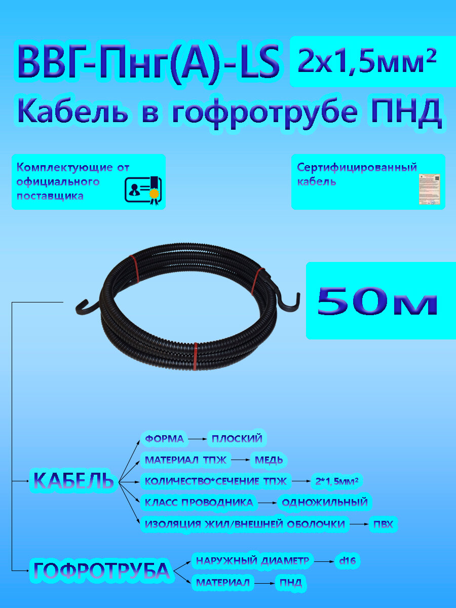 Ниже Вы можете прочитать отзывы на Кабель ВВГ-Пнг(А)-LS 2х1,5 ОК 0,66 кВ ГОСТ в черной гофротрубе ПНД d16 (50 м) универсальный L-фаза, ознакомится с подробными характеристиками, посмотреть интересные обзоры и фотографии на Кабель ВВГ-Пнг(А)-LS 2х1,5 ОК 0,66 кВ ГОСТ в черной гофротрубе ПНД d16 (50 м) универсальный L-фаза.