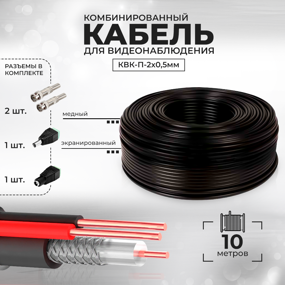Купить Кабель КВК для видеонаблюдения с коннекторами RG-59 + 2 x 0,5 кв. мм бухта 10 метров Ps-Link CBK10