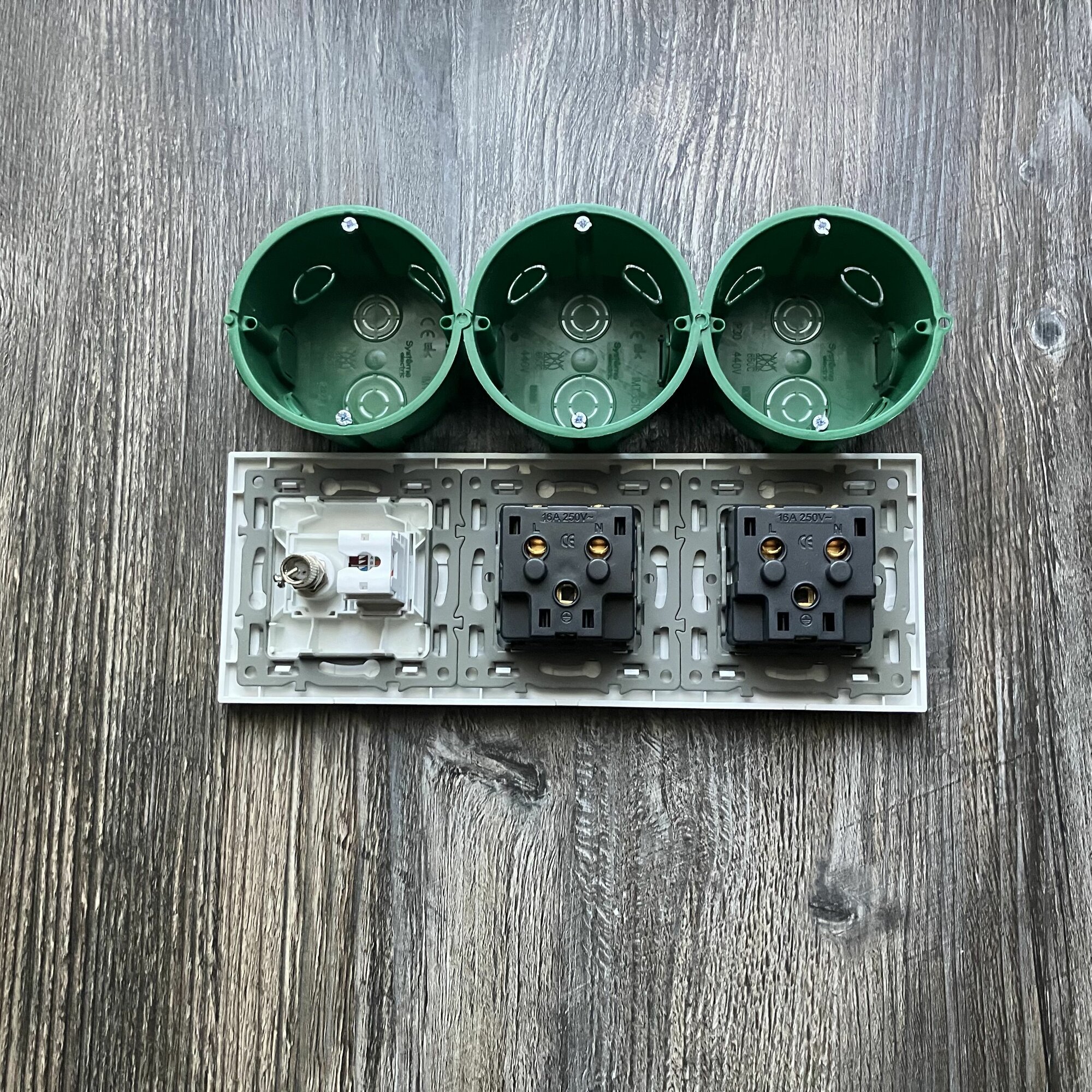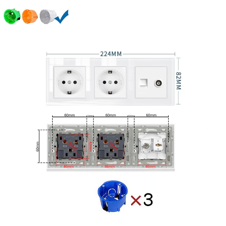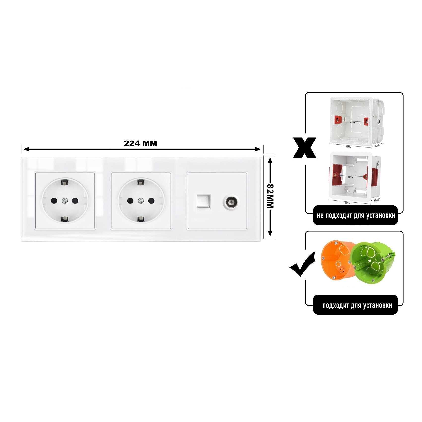 СохранитьРозетка ТВ и интернет 3 поста, антенна ТВ/компьютер RJ-45 CAT6, рамка закаленное стекло 224*82*8 мм, цвет белый интересное: