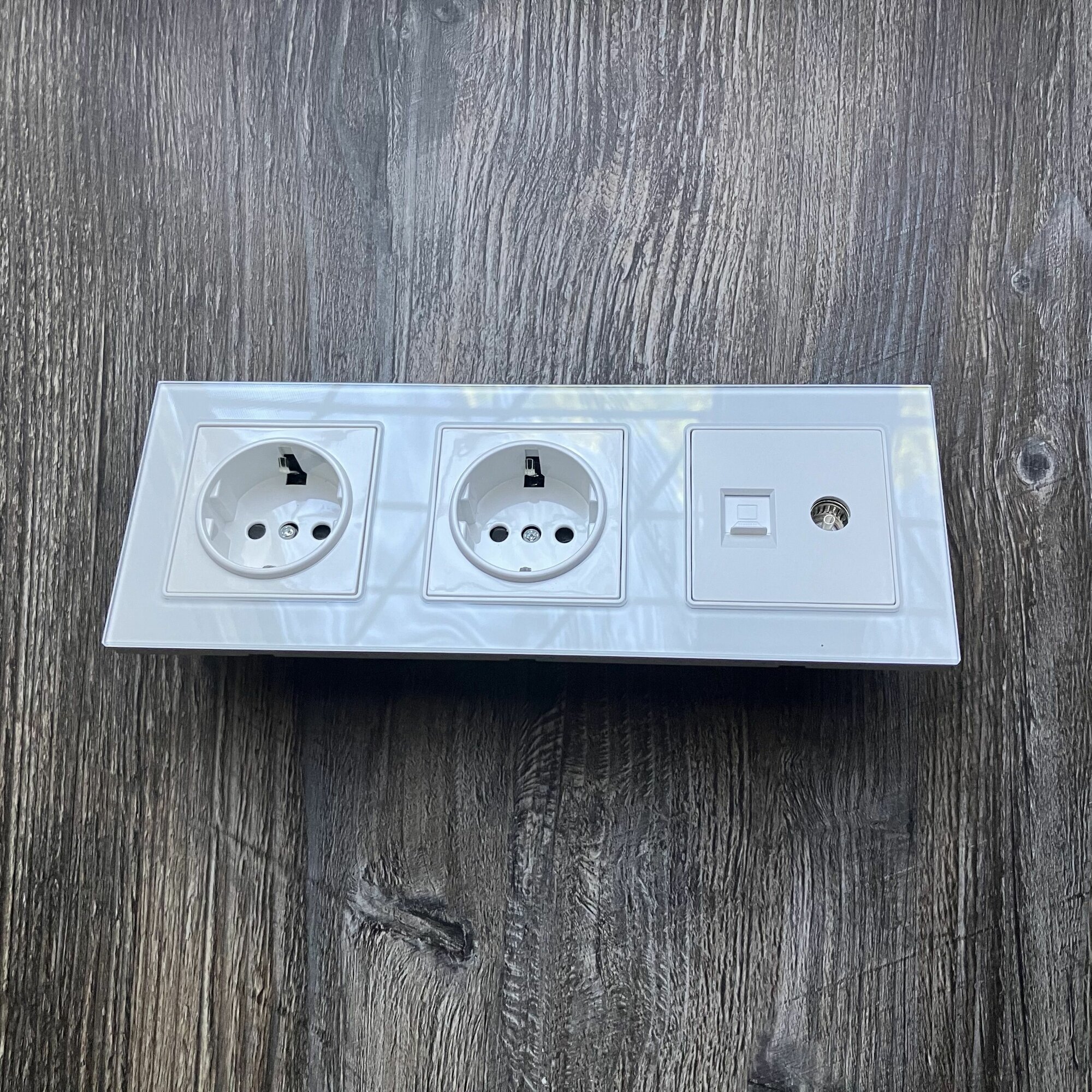 Купить Розетка ТВ и интернет 3 поста, антенна ТВ/компьютер RJ-45 CAT6, рамка закаленное стекло 224*82*8 мм, цвет белый