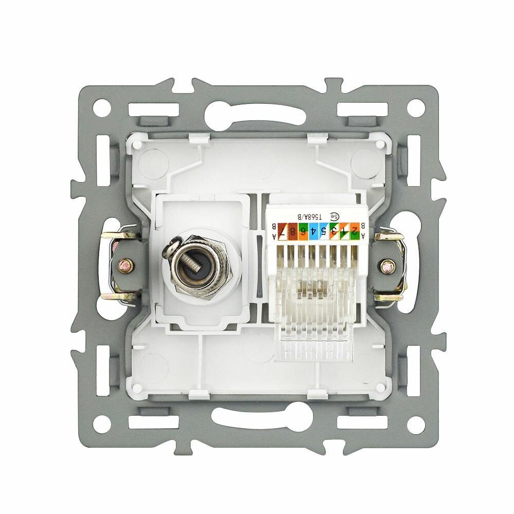 Розетка ТВ и интернет 1 пост, антенна/компьютер RJ-45-CAT5E/ТВ, интернет+ТВ, рамка закаленное стекло, цвет белый