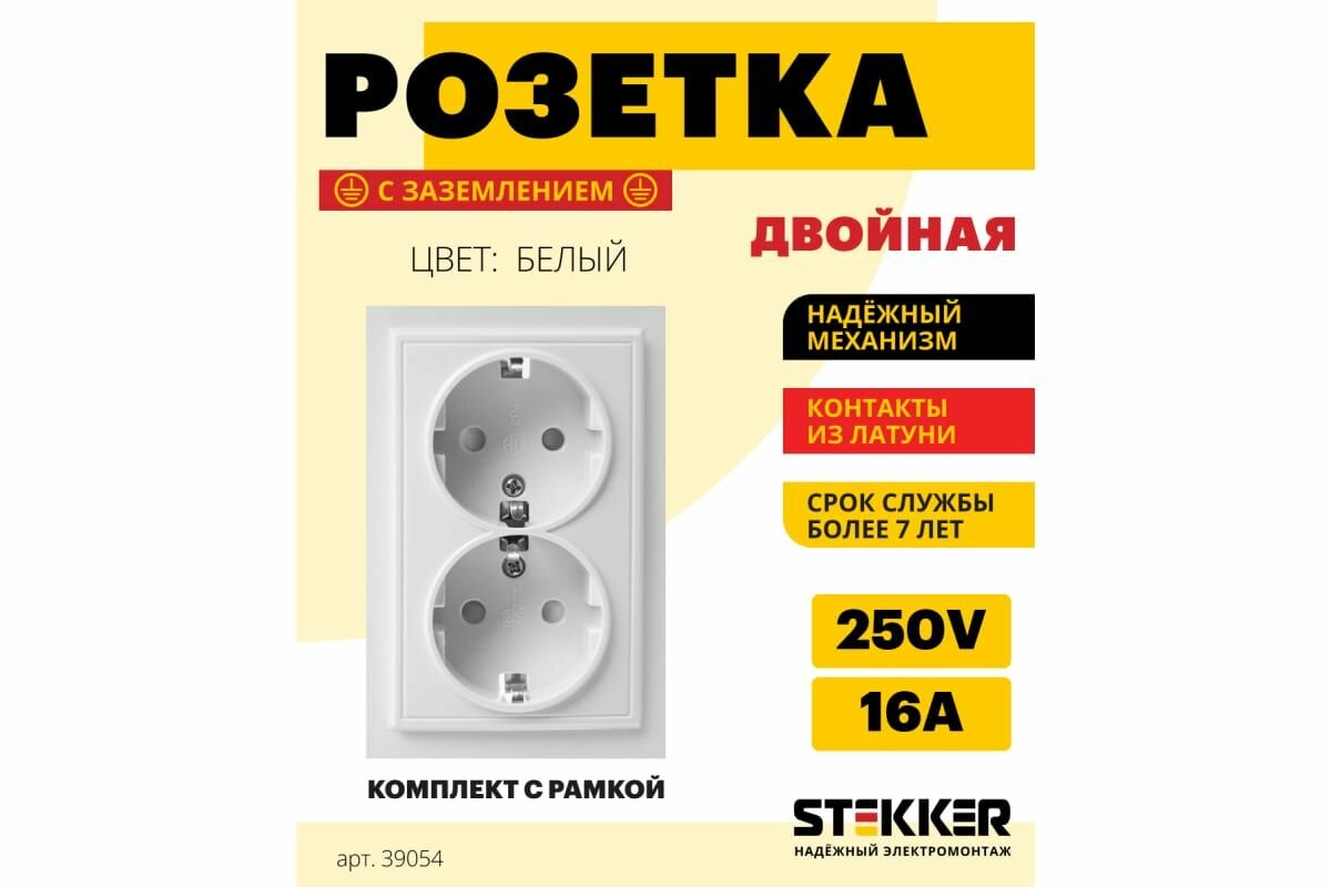 Розетка двухместная STEKKER 250В, 16А, с заземлением, серия Эрна, белый