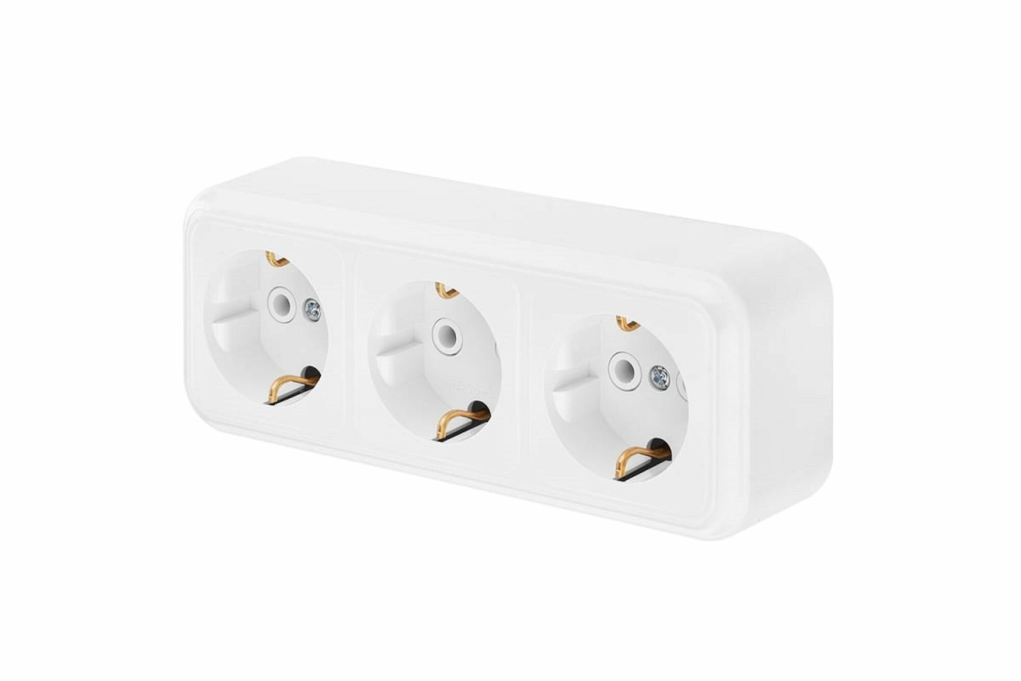 Купить Розетка тройная Bylectrica Пралеска, с заземляющим контактом, открытой установки, 16А, 250В, белая. РА16-265.